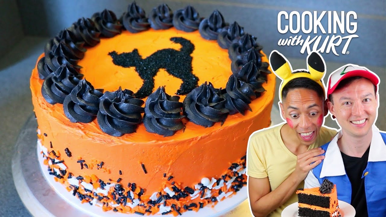 Learn how to make a Black Cat Halloween Cake! Layers of moist black velvet cake are filled and covered with an orange-colored and deliciously light Italian meringue buttercream frosting, and decorated with a black cat on top! It’s the perfectly spooooky Halloween treat. Enjoy!