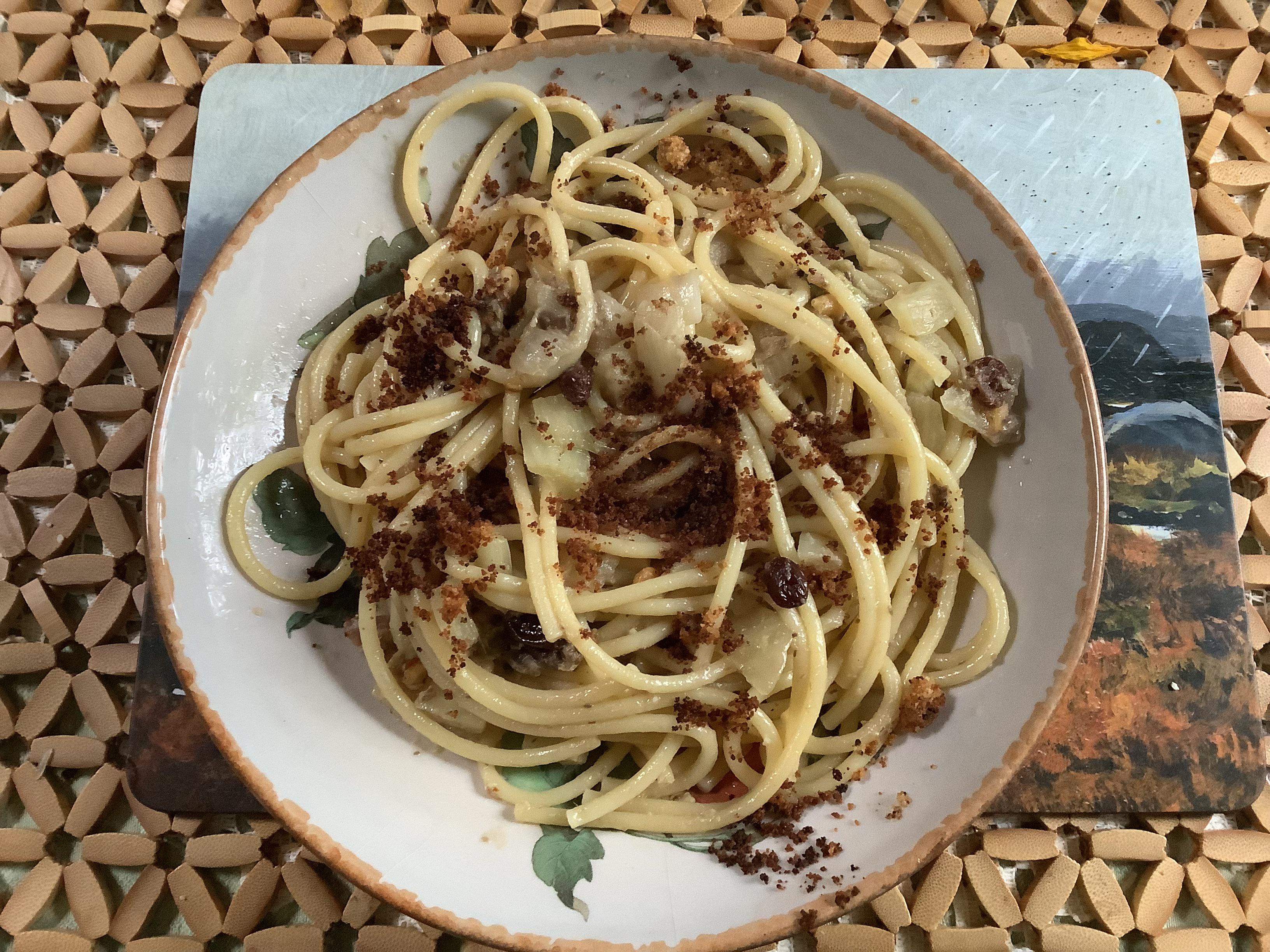 bottle-of-smoke 3 years ago Hope you won’t judge a book by it’s cover 🙂Bucatini with sardines, anchovies, fennel, onion, fennel seed, white wine, raisins, pine nuts, and toasted bread crumbs.