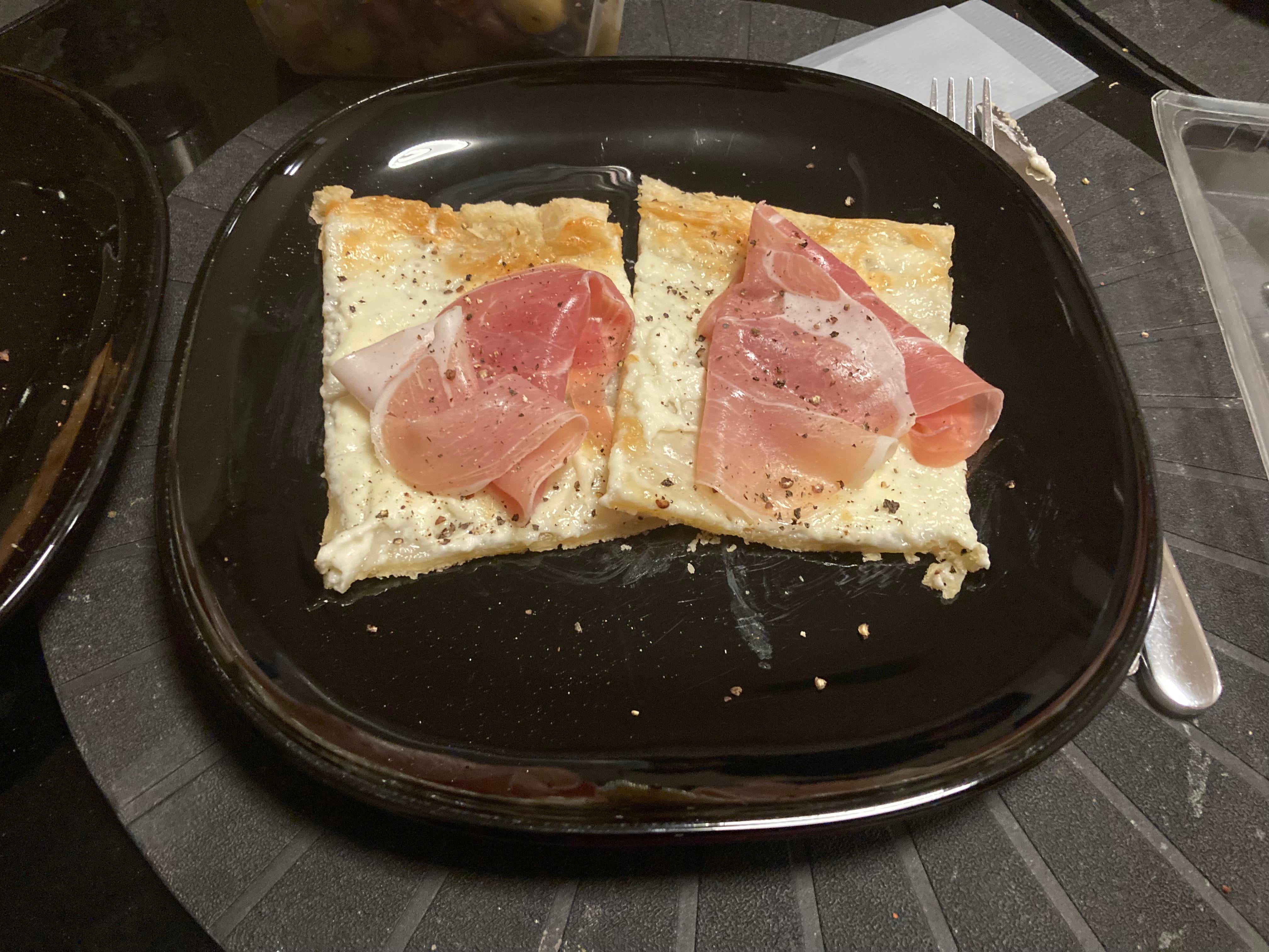 Homemade focaccia di Recco style pastry (puff pastry + homemade stracchino cheese)