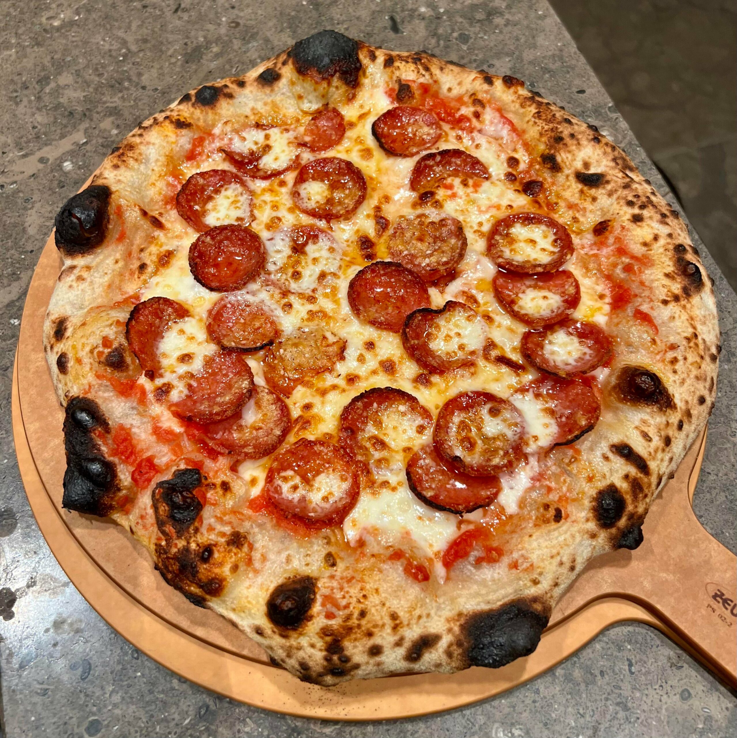 San Marzano with salt, pepperoni, mozz, dusted with Reggiano.