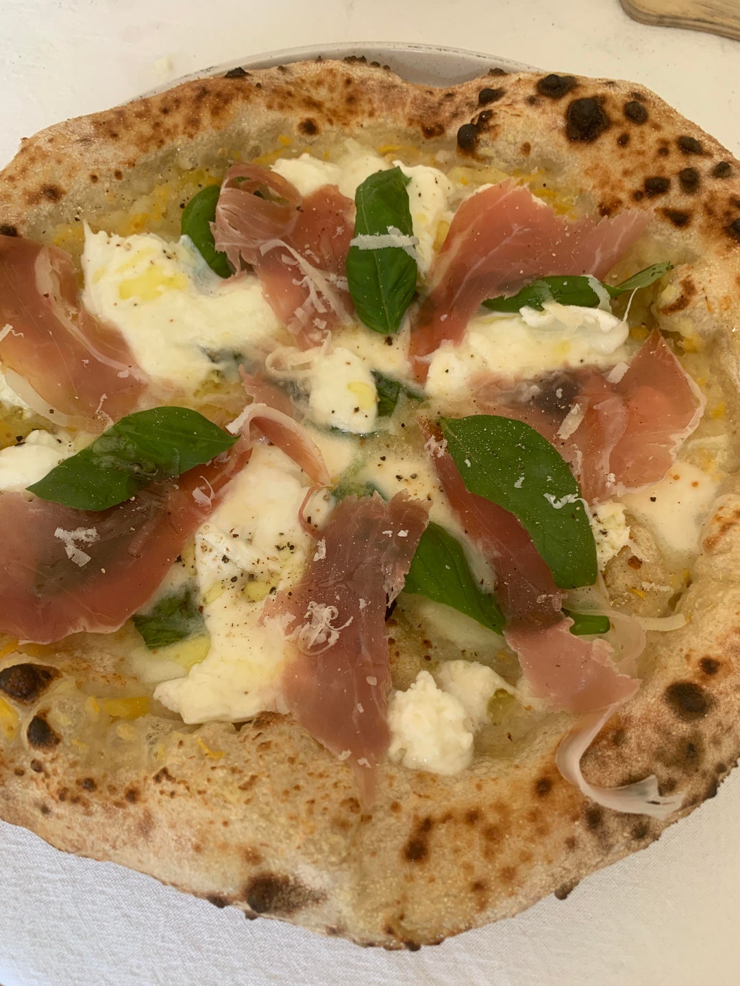 And after baking : prosciutto crudo, fresh mozzarella di bufala, parmesan, black pepper, basil, olive oil