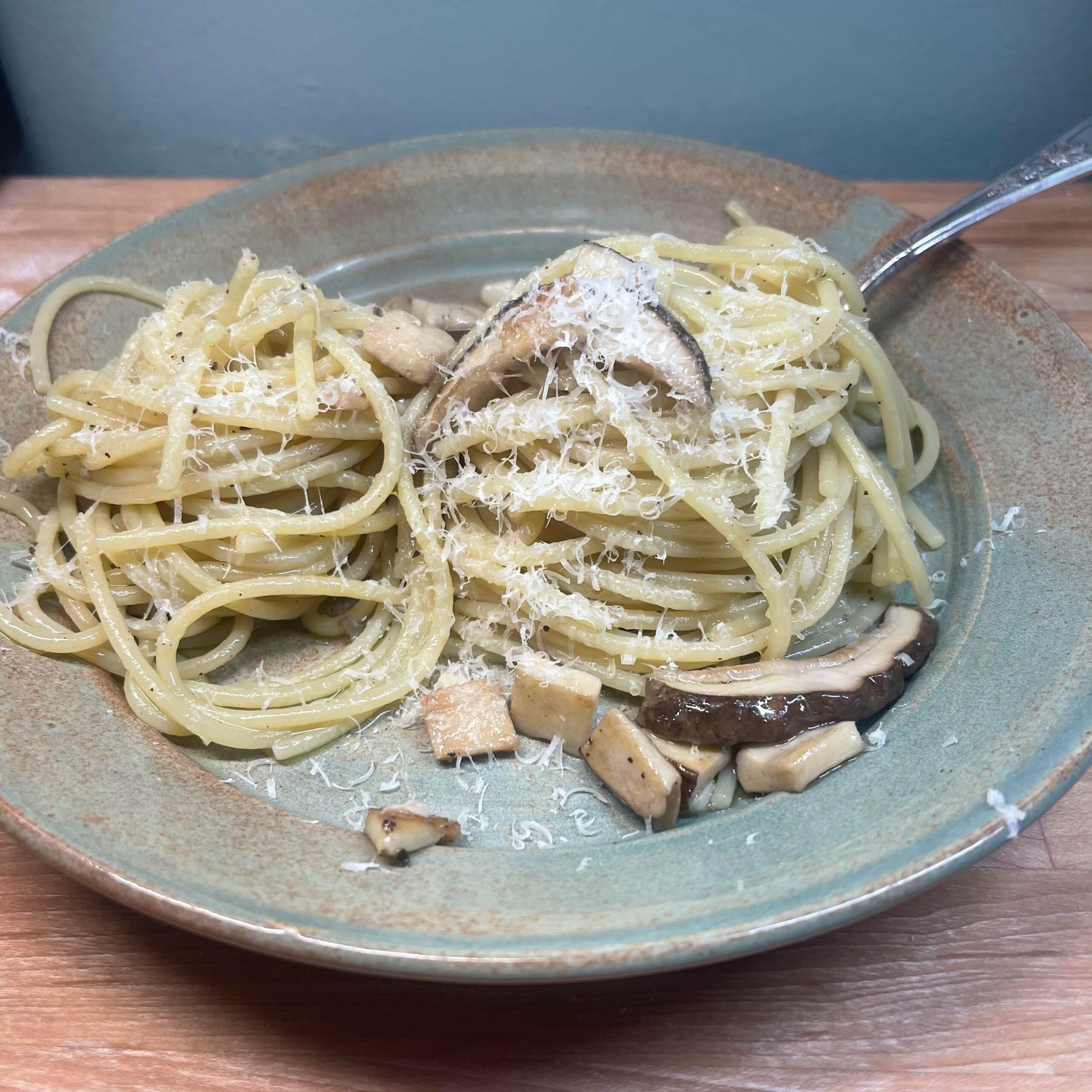 After a brief sauté, I added the spaghetti, some spaghetti water, and tossed. Served with the porcinis on top and a bit of parmigiano and fresh pepper.