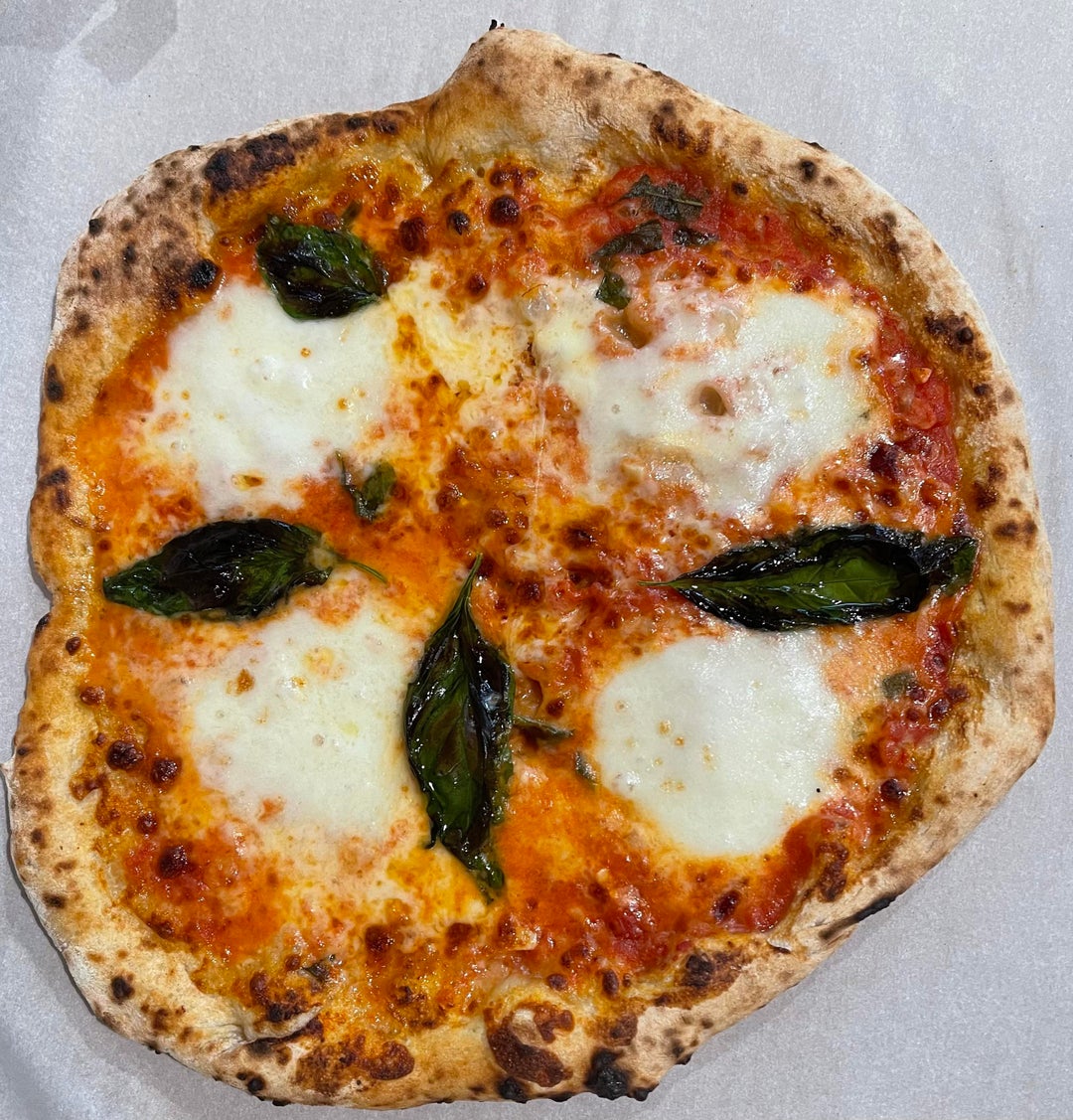 Looks good I never worry about the roundness. You can always stretch it a bit just before you slide it in the oven. Lots of time I hold back the basil add add it when it is almost cooked then it is not charred. 3 day dough Is the way to go ๐