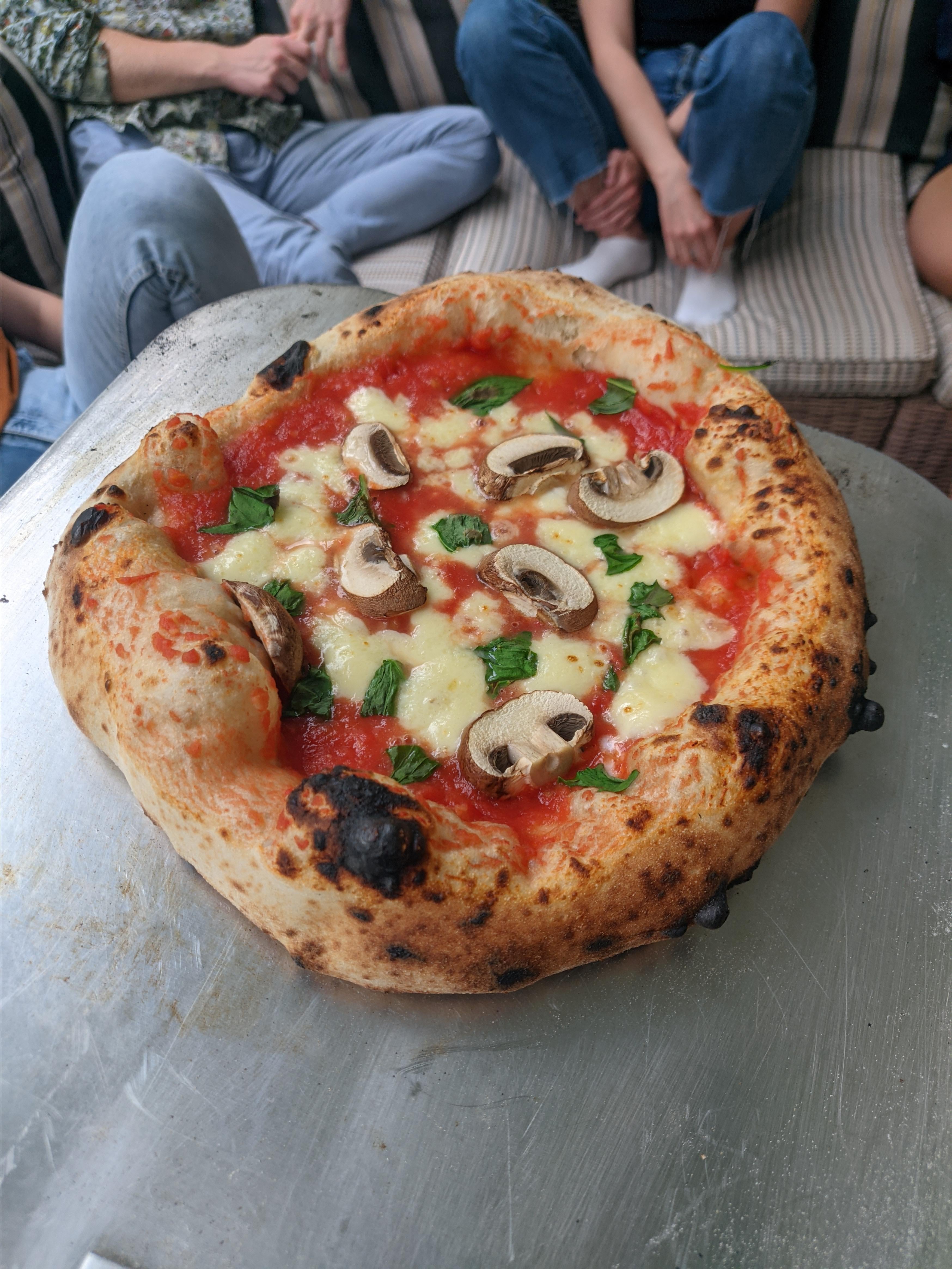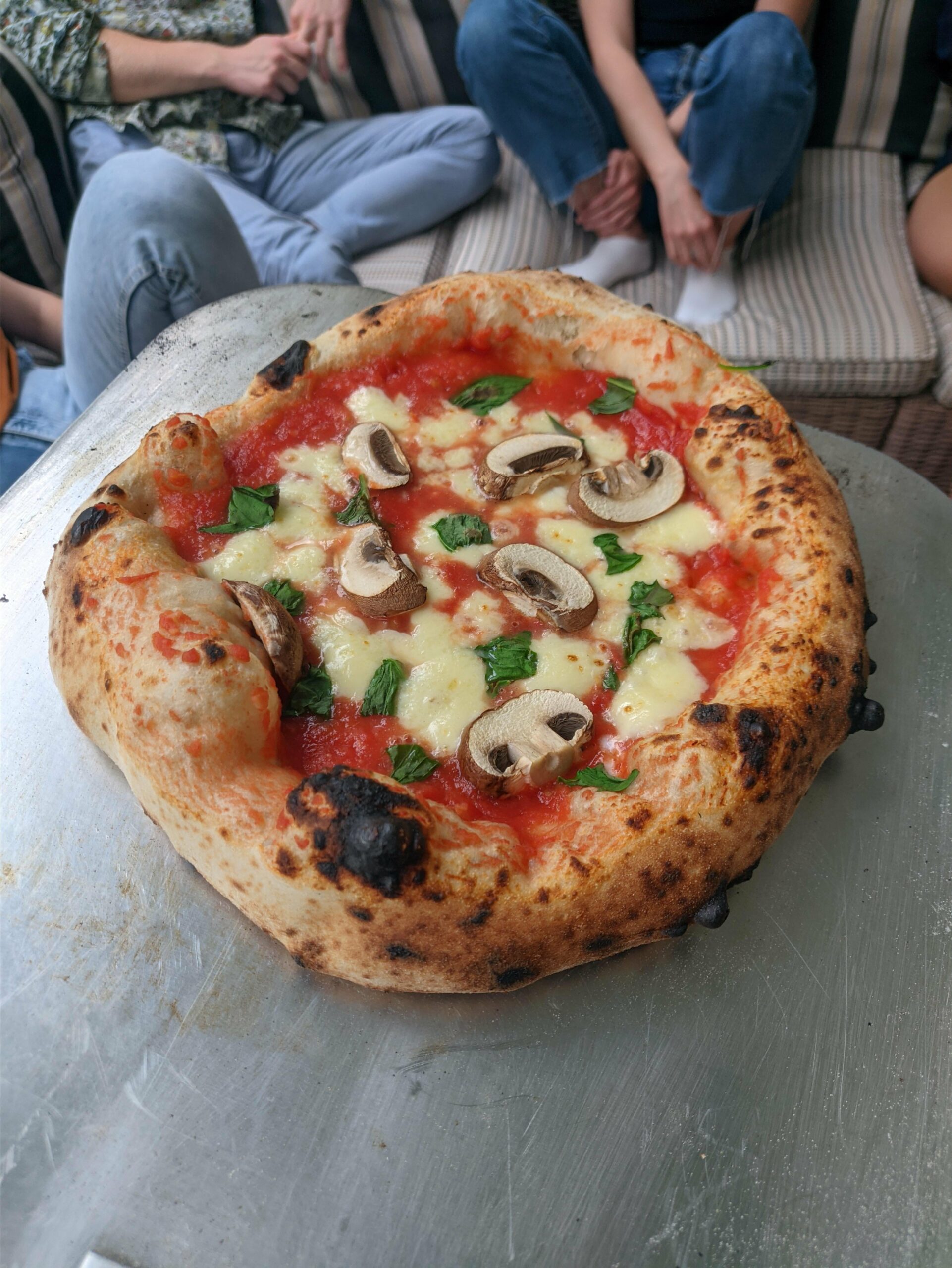 Topped with San Marzano, fior di latte, few mushrooms, basil and olive oil.