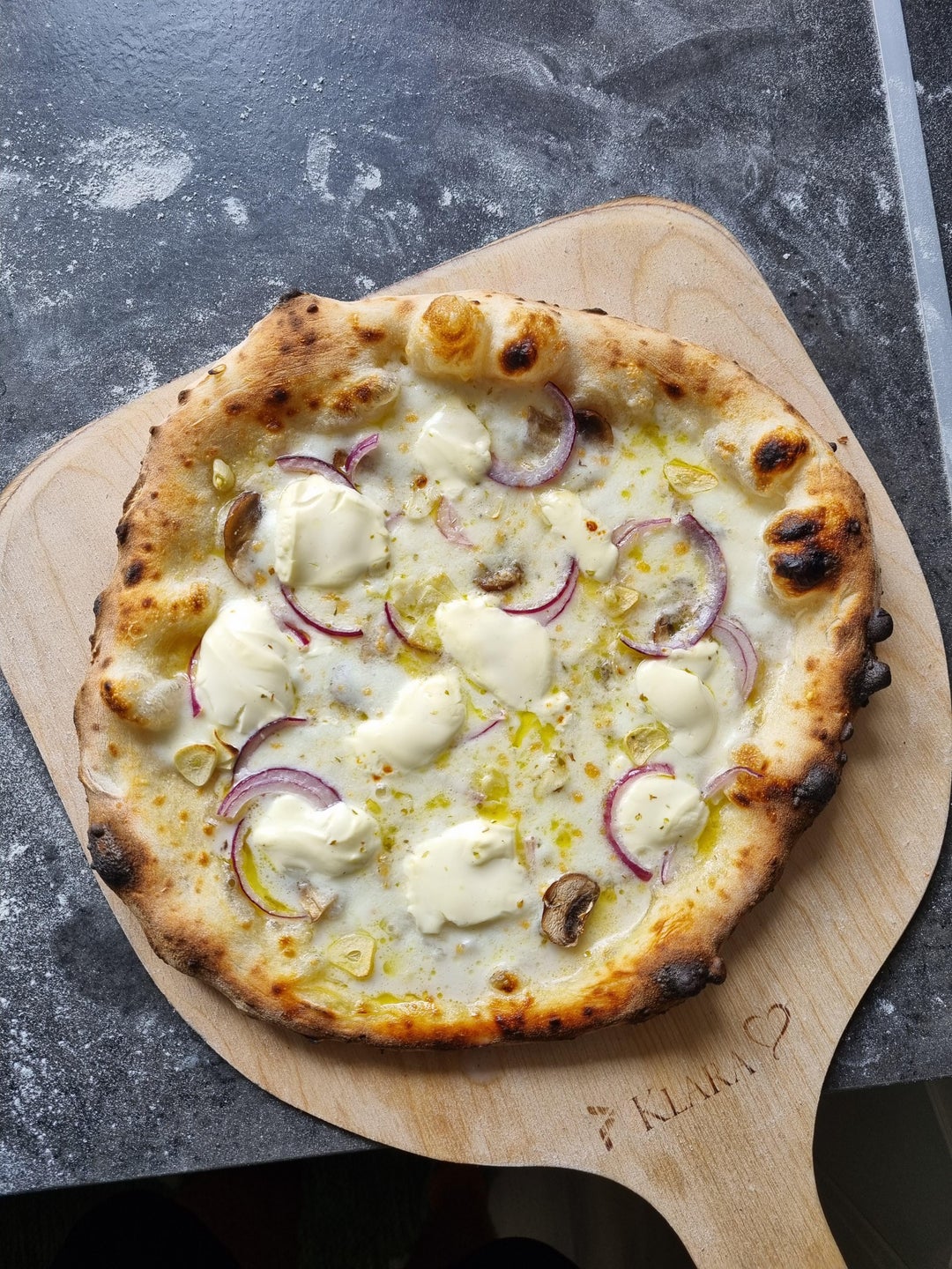 Garlic, mozzarella, red onion, mushrooms, pecorino, parmigiano, oliveoil and creme fraiche