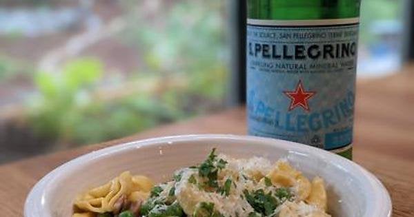 Pranzo oggi. Tortellini fatti a mano con pancetta e piselli.