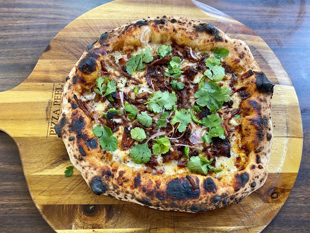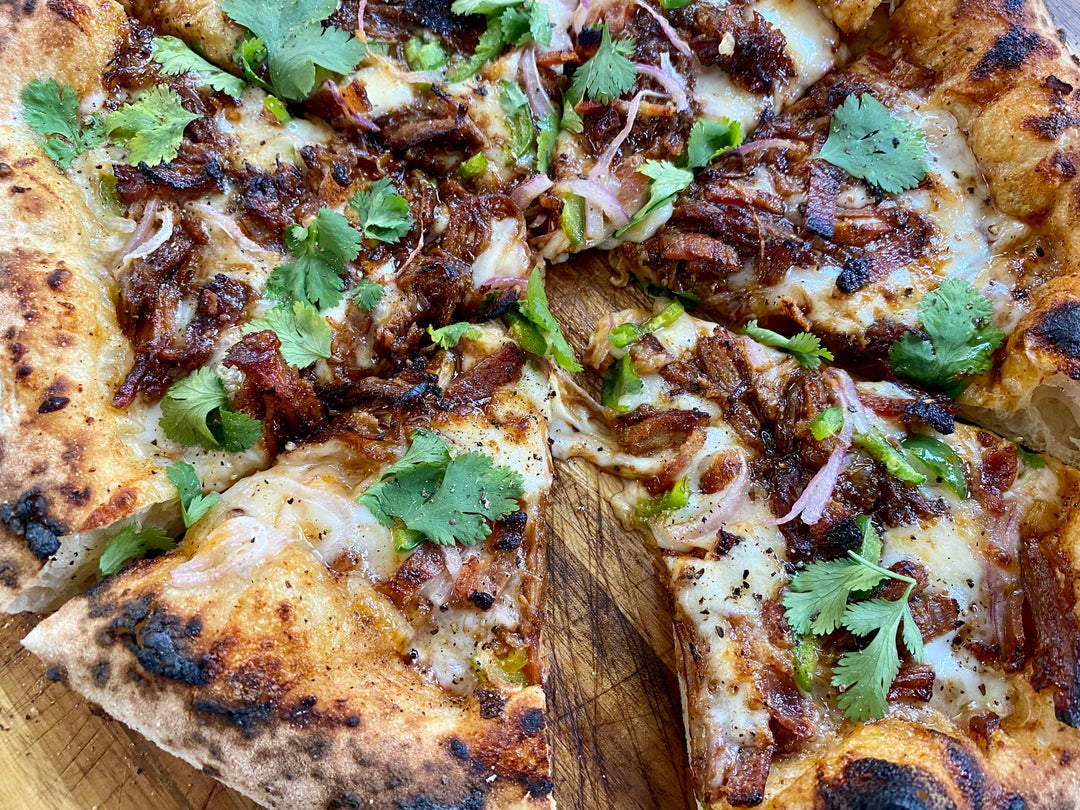 Smoked Pork BBQ pizza with red onions, jalapeños, bacon, and cilantro. It has 4 cheeses, mozzarella, provolone, smoked Gouda and sharp white cheddar. The sauce base is a thin layer of blue hogs bbq Smokey Mountain. The pork was smoked on Yoder YS 640s. The dough is a 48 hour cold fermented dough.