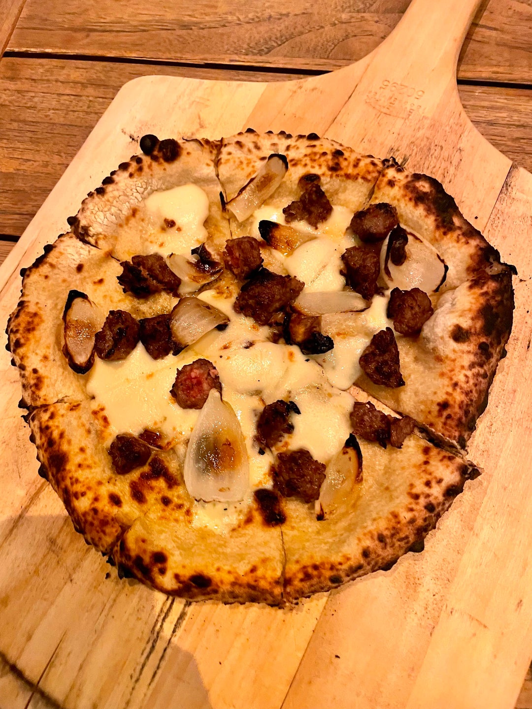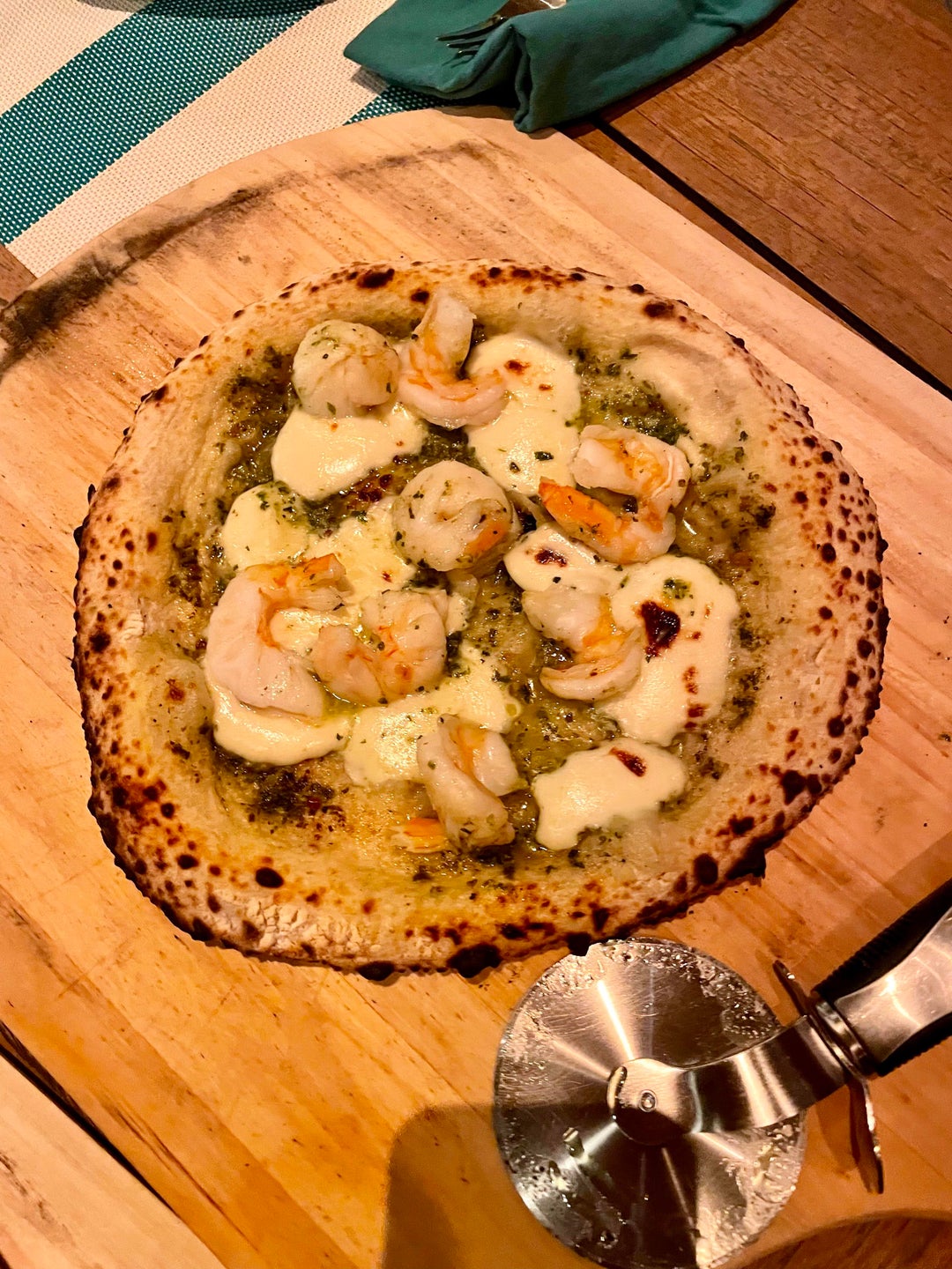 Margherita, sausage & Onion, shrimp & pesto. 00 caputo sourdough .75% .005% cdy, 62% 48h @ 61F