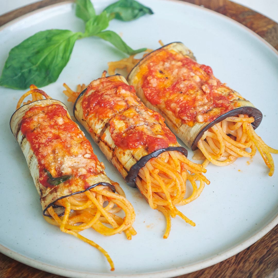 Rolled eggplant involtini pasta is a classic Sicilian dish. Delicate eggplant slices are filled with spaghetti and tomato sauce and topped with melted cheese. The exposed spaghetti gets crispy in the oven while the inside stays moist with melted cheese. This recipe is tasty, vegetarian and also fun to make.