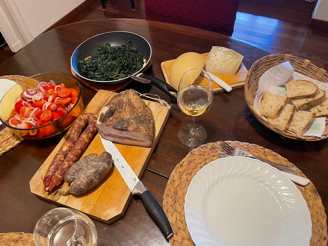 If god made a tomato & an onion it would be the cippola di tropea (an onion that’s as sweet as an apple) & piennolo di vesuvio (a tomato that’s lovely as is). Made into a salad, served with pan fried chicory; pecorino & cacciocavallo cheeses; and an assortment of pork salame.