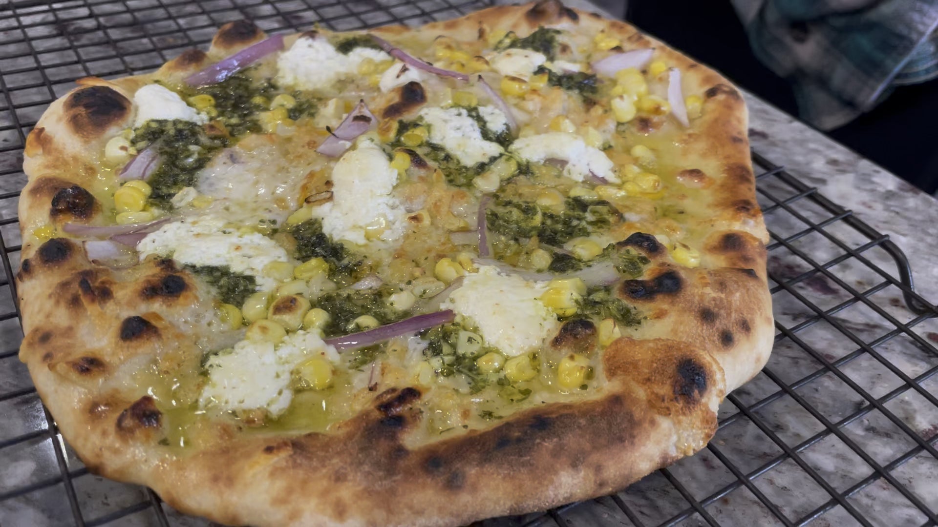 Same day dough, with a brief cold proof. Garlic-crisp evoo base, goat Gouda, red onion, fresh sweet corn, Serrano chimichurri, fresh goat cheese.