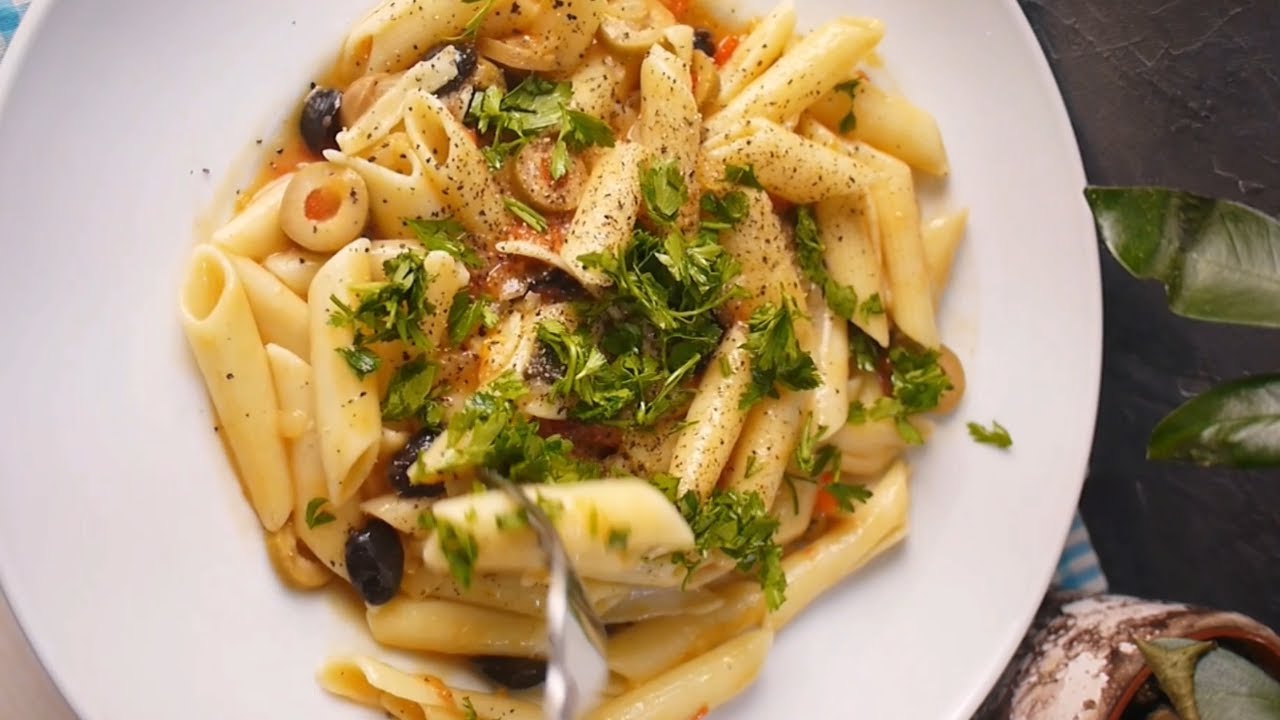 very easy pasta recipe with onions , tomato and olives