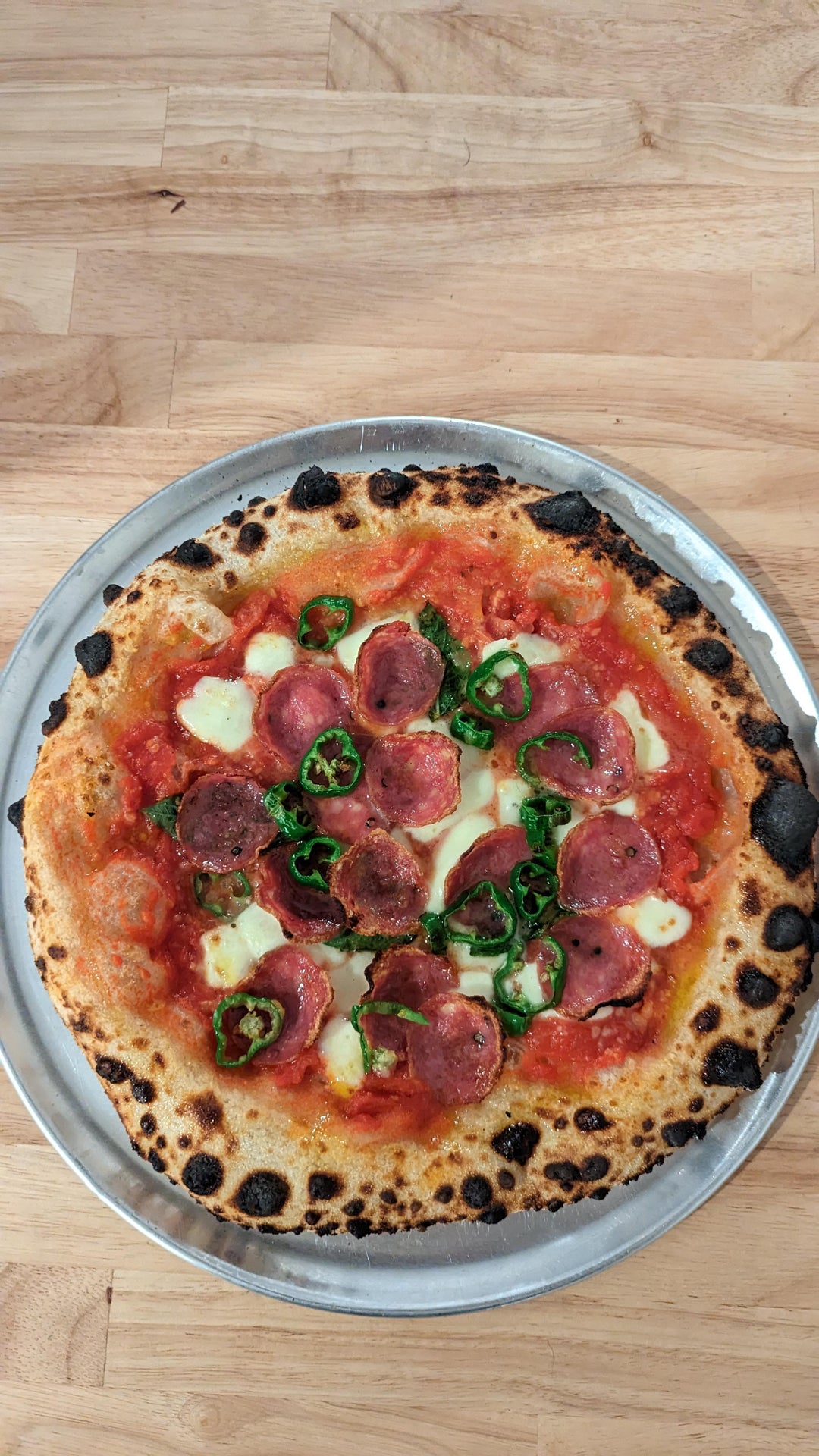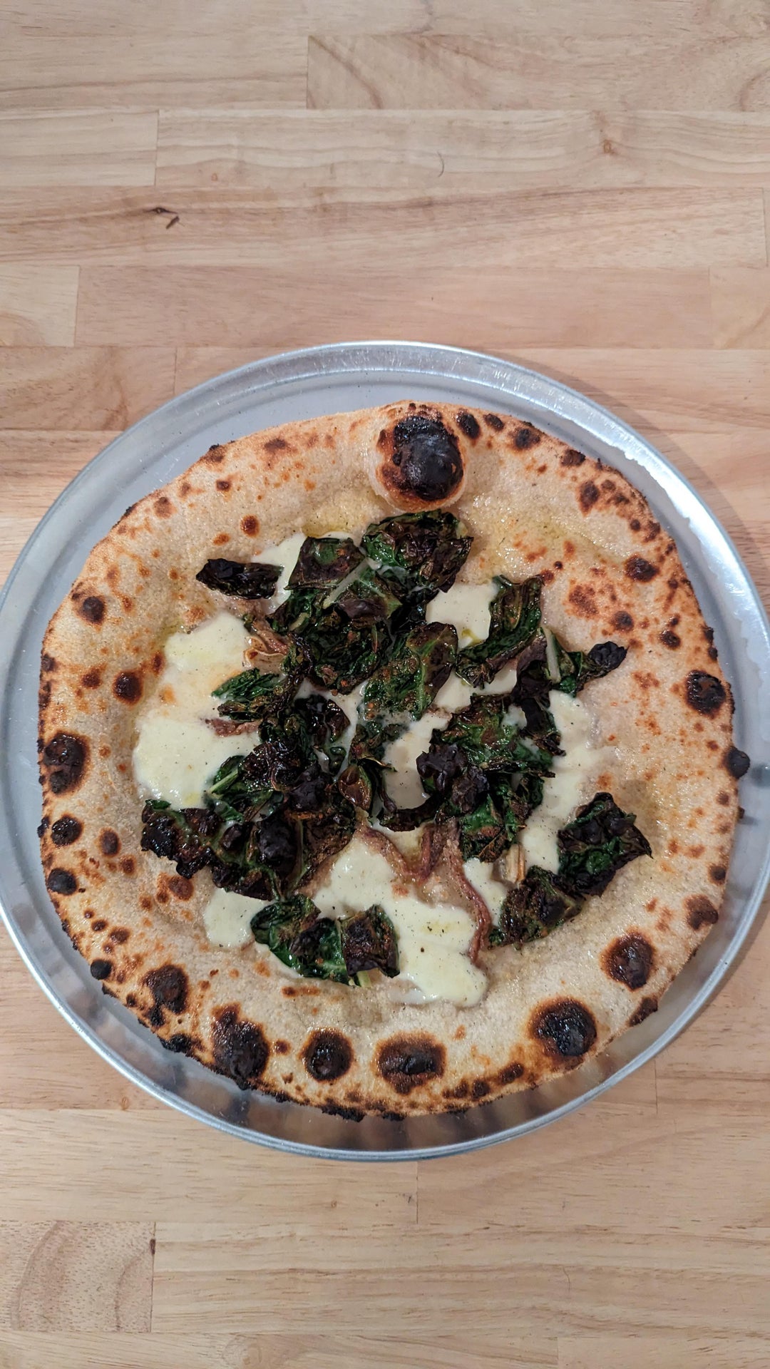 48 hr cold fermented sourdough using Caputo Chef’s flour and a white whole wheat starter (~11%), 67% hydration, 3% salt. Took the dough out of the fridge 4 hours before baking, but I suspect the black leopard spots are because the dough was still a bit cold. I guess I have to let it sit longer than 4 hours? Room temp was around 68F. Baked in Ooni Karu 12 with charcoal base and white oak, stone temps were between 825-950.