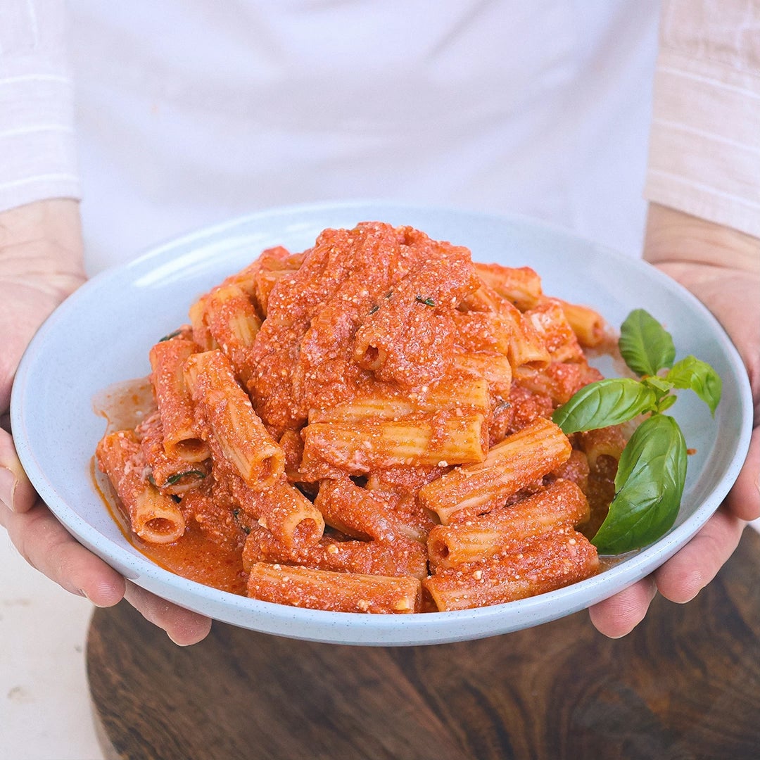 Tomato Ricotta Pasta uses passata, basil, and fresh ricotta to create a creamy sauce with a flavour that is surprisingly addictive! If you have some ricotta in the fridge, cook this up instead of a plan tomato sauce. The taste of this dish takes me back to my teenage years and it’s so quick and simple, you can make it up at any time of the day – for one or many!