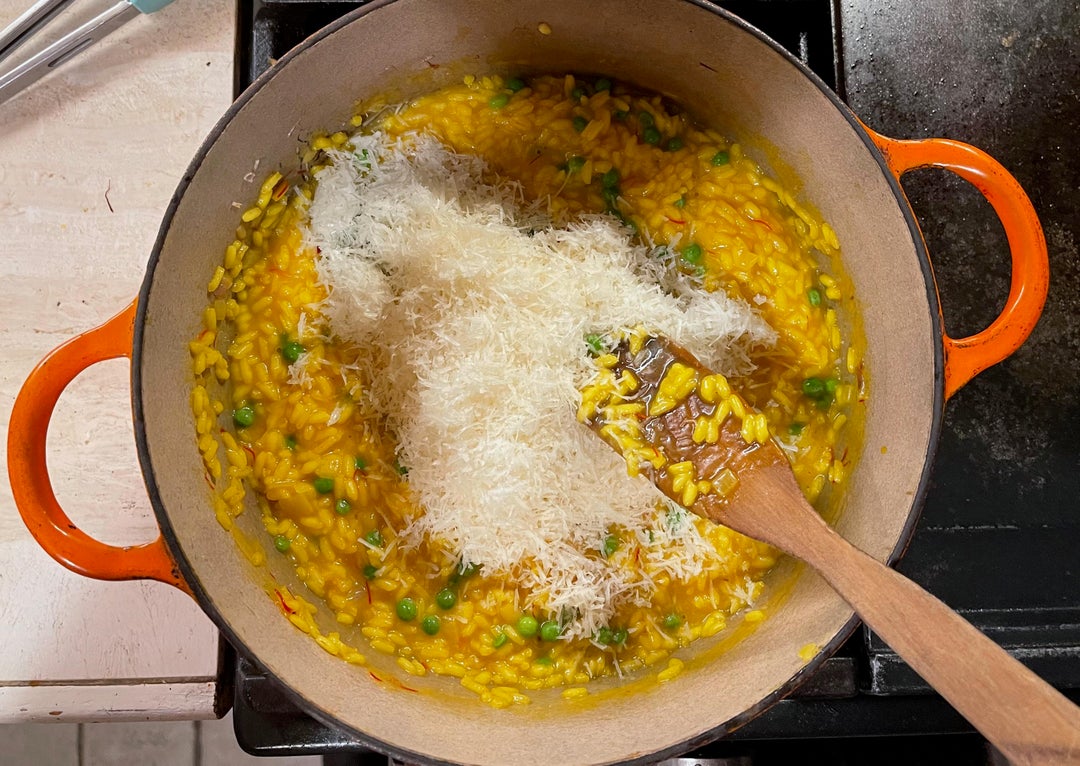 Can i give you a couple of suggestions? I see you have some quality saffron, you could have used like one fifth of that amount and the result would still have been perfect. Risotto is a cheap dish, with that mich saffron you are making it a lot more expensive than it needs imo. Other thing, when you add ingredients to mantecate just stir roughly and leave it rest a couple of minutes, there is no need to keep stirring