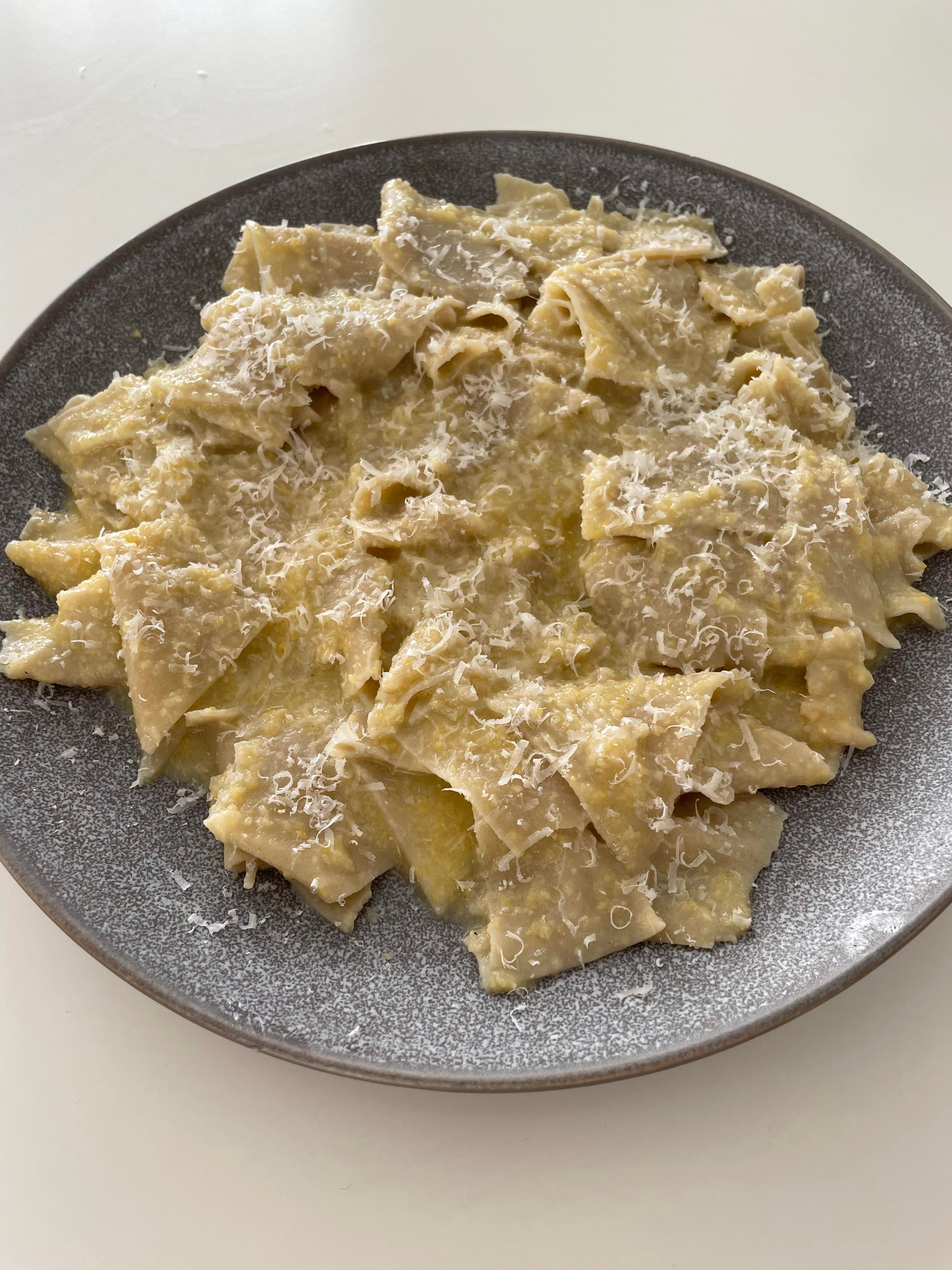 To make the pasta, you will need: – 3/4 cup (100g) buckwheat flour – 3/4 cup (100g) semolina flour, plus extra for dusting – 2 eggs – Salt – 2 tbsp (30g) unsalted butter, room temperature To make the sauce, you will need: – Salt – 3 1/2 tbsp (50g) unsalted butter – 2/4 cup (40g) cornmeal – Grated Montasio cheese (or substitute Parmigiano-Reggiano) for topping