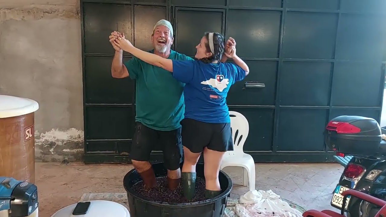 Stomping grapes to make wine on a farm in Sicily. American expats in Sicily.