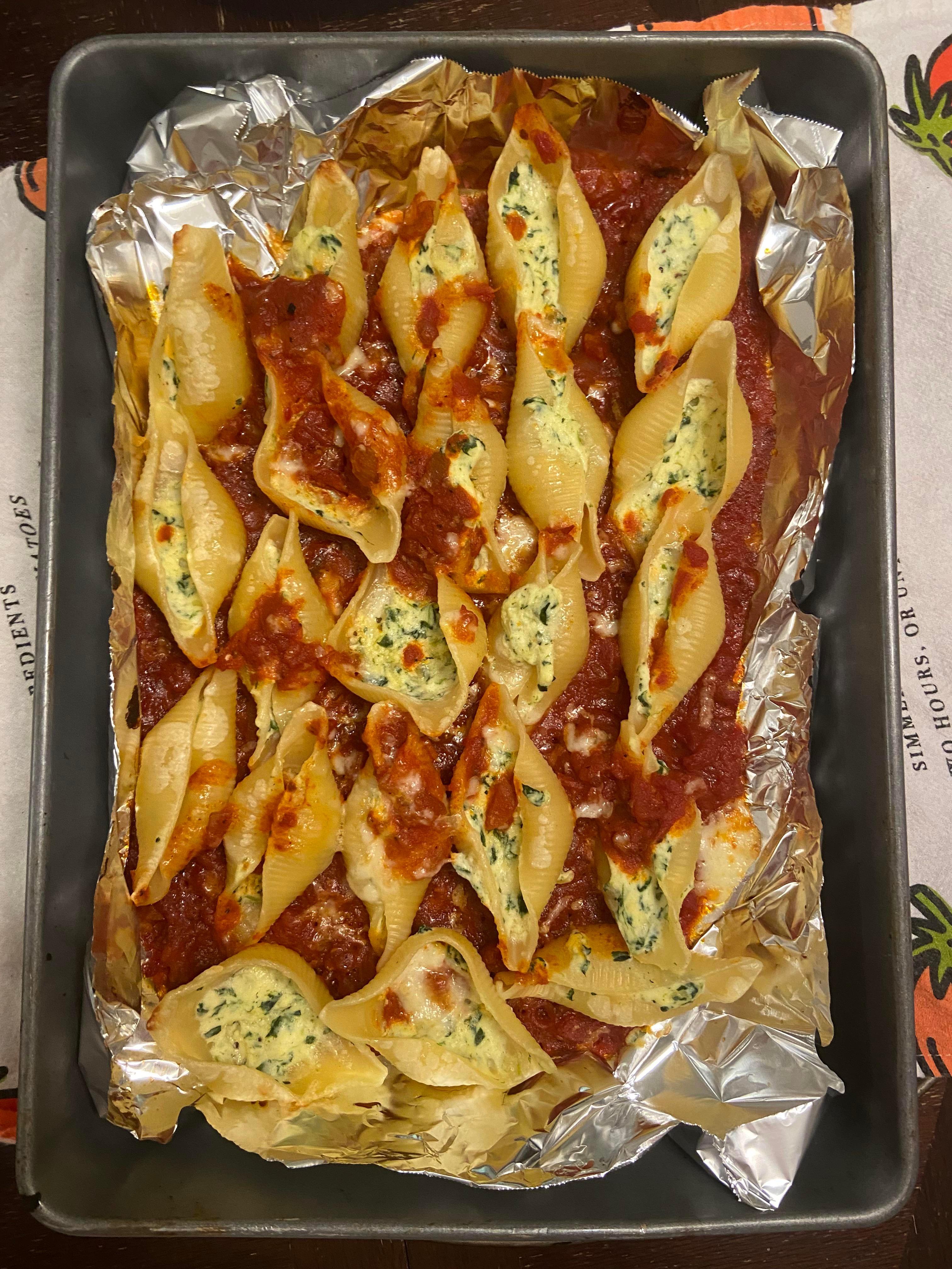 Nice job! If you want each shell to close so the ricotta doesn’t dry out and avoid the edges from getting crispy hard… fill each shell with the ricotta mixture and pull one side of the opening over and the ricotta acts to help sell the she shut