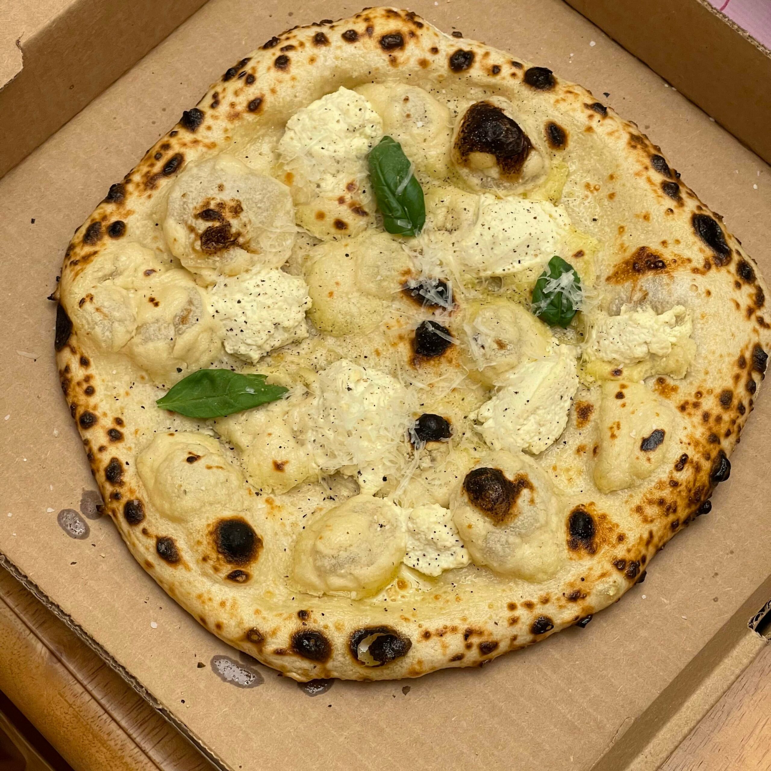70% hydration 48 hours. Garlic oil base, cashew mozzarella, tofu ricotta. Roccbox!