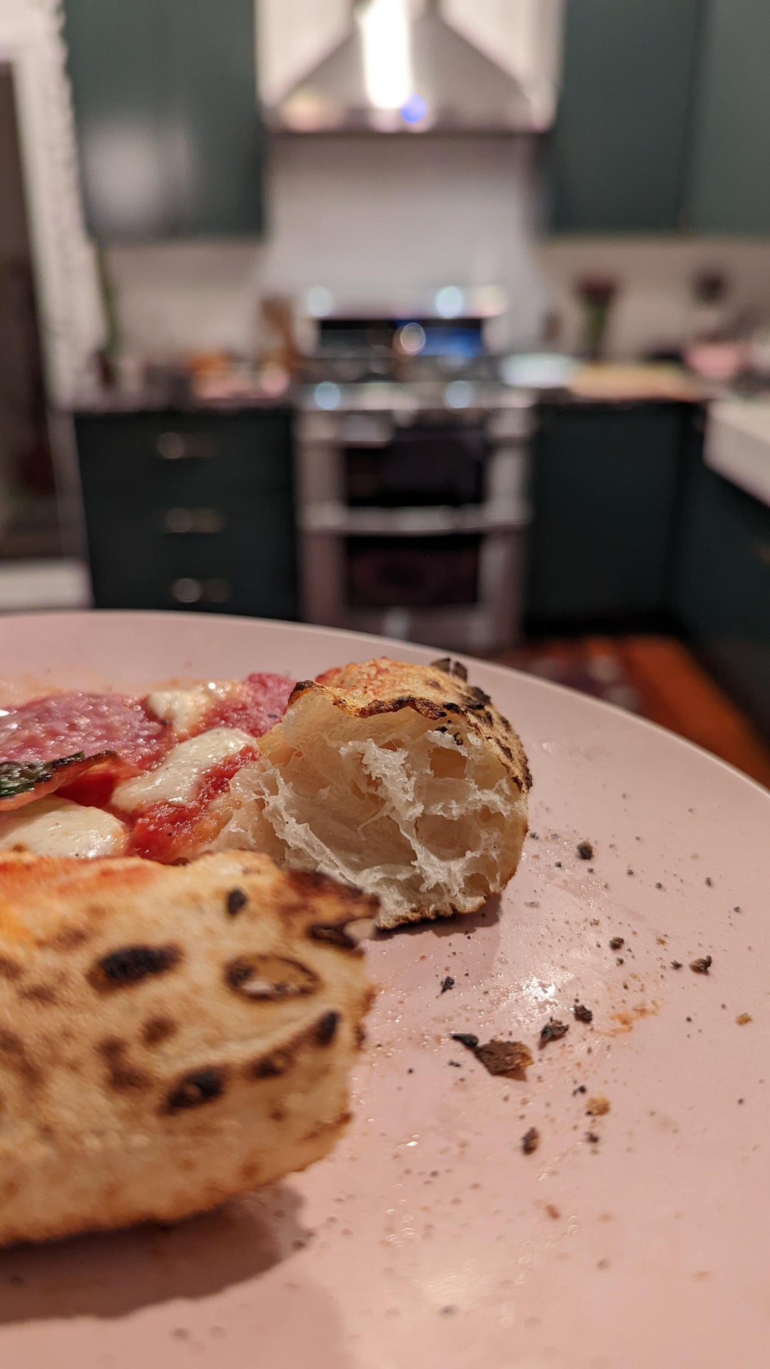 This time, my starter was tripling within 6-8 hours consistently and I let the dough sit at RT out of the fridge at least 6 hours before cooking. I think this helped the dough finish proofing and rise better than my last attempt. All in all much better results but I’m still hoping for an even airier cornicione next time!