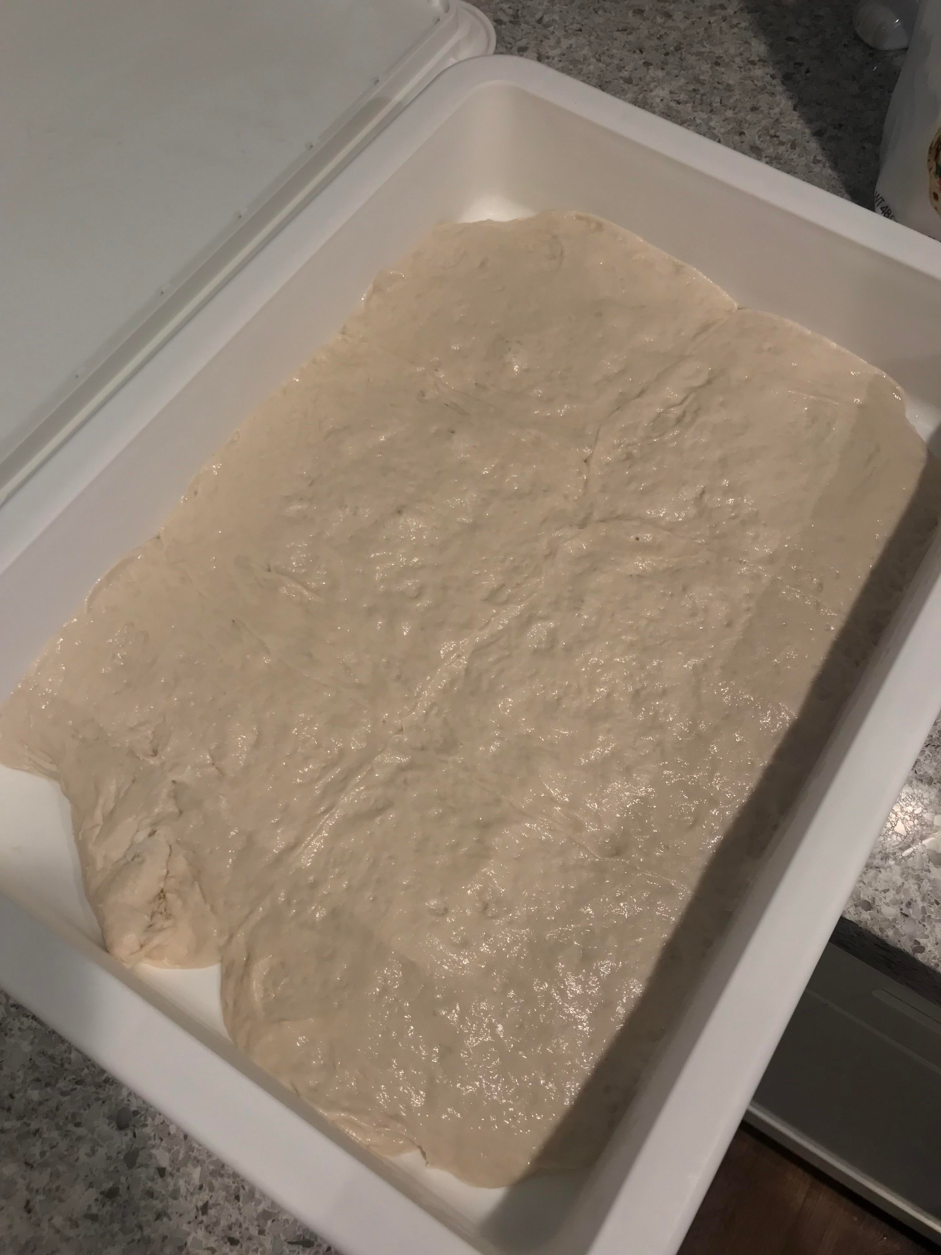– 500ml warm water – half teaspoon of yeast (Caputo Lievito Secco dry yeast) – 1.5 tablespoon of salt – added flour in KitchenAid until dough was no longer tearing (still pretty wet and sticky)