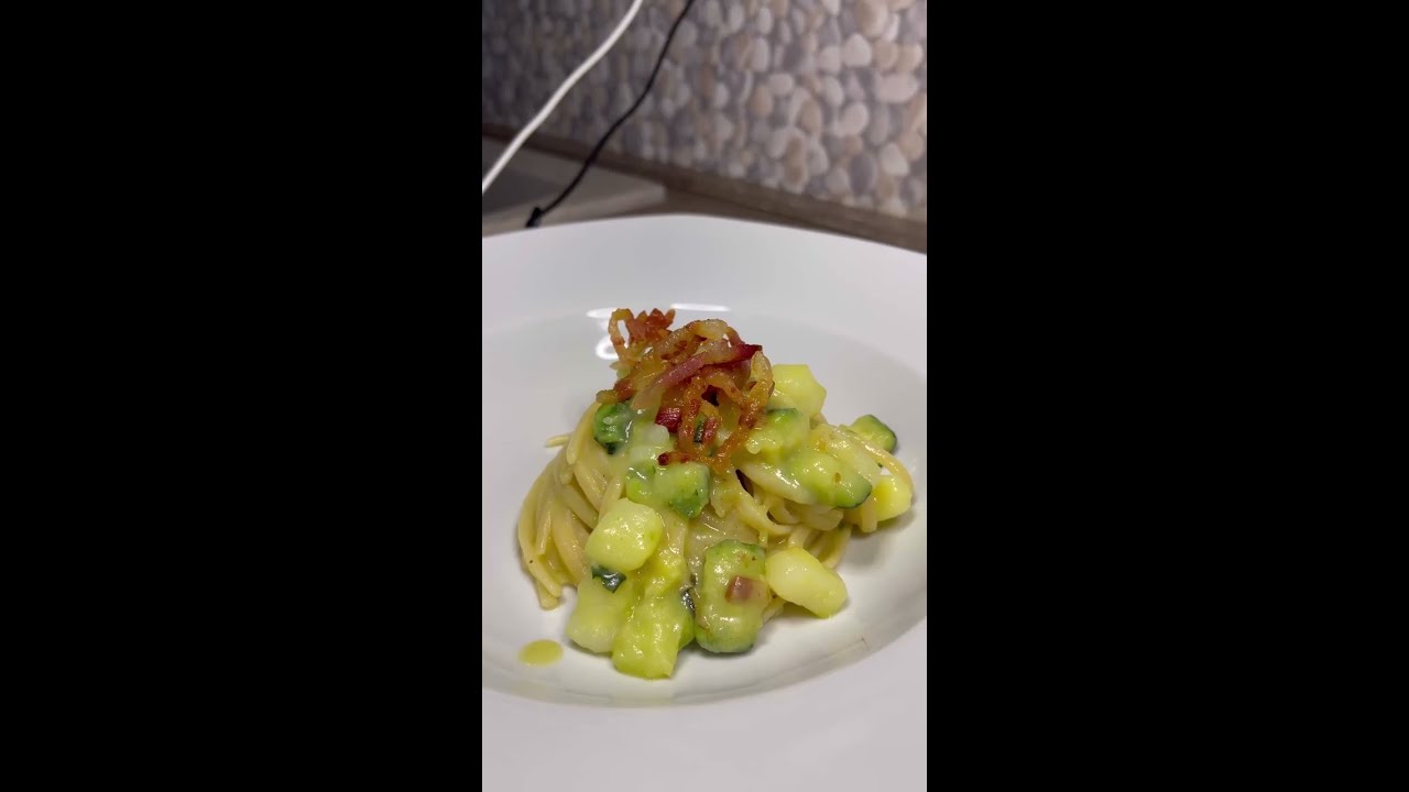 Cut the speck into strips, add to a pan and brown until crispy. Remove from the pan and dry. Cut the zucchini into chunks and cook it for a few minutes with the fat released by the speck.
