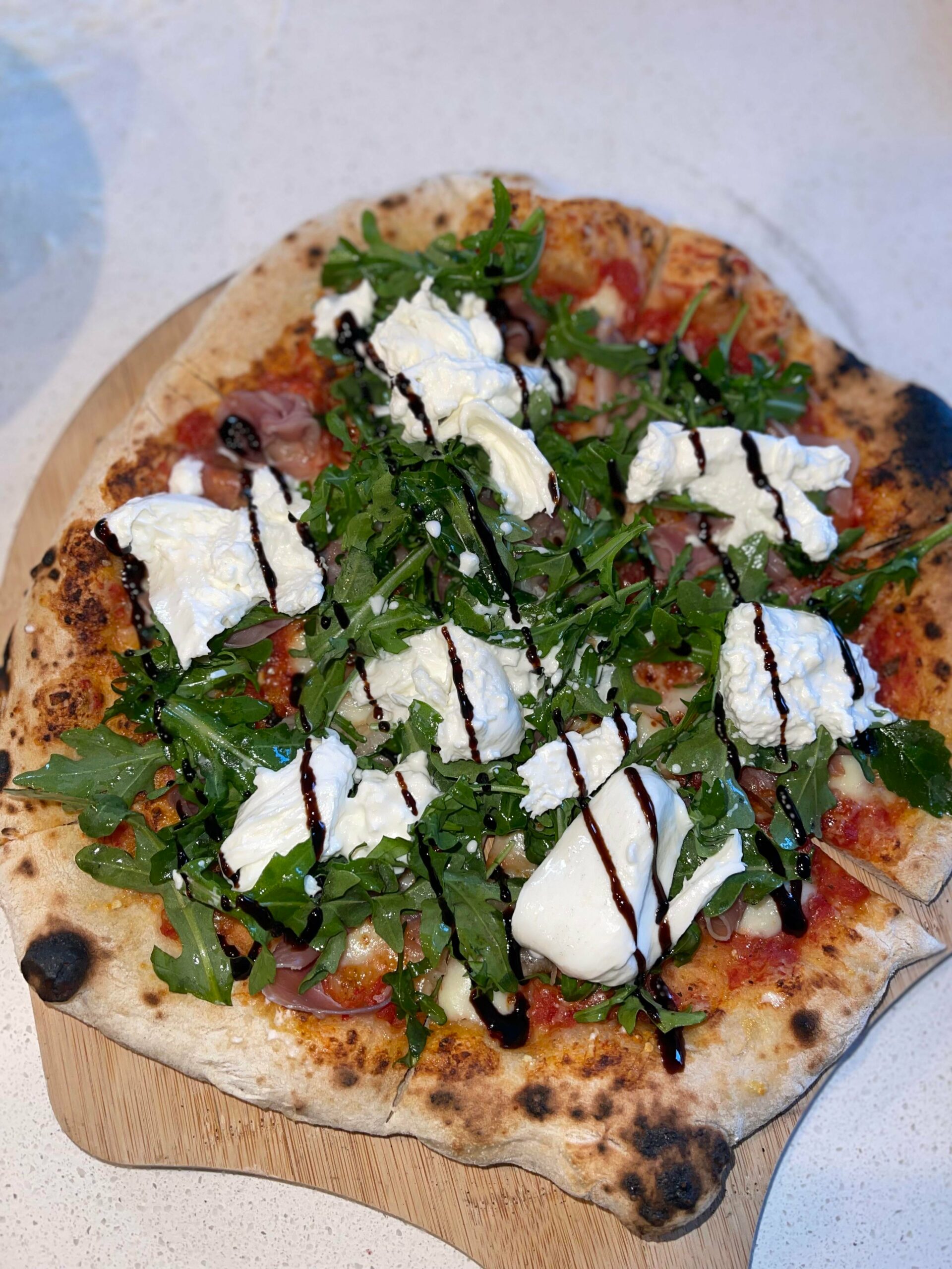 Burrata, Prosciutto, and Arugula with a Basalmic Glaze topper