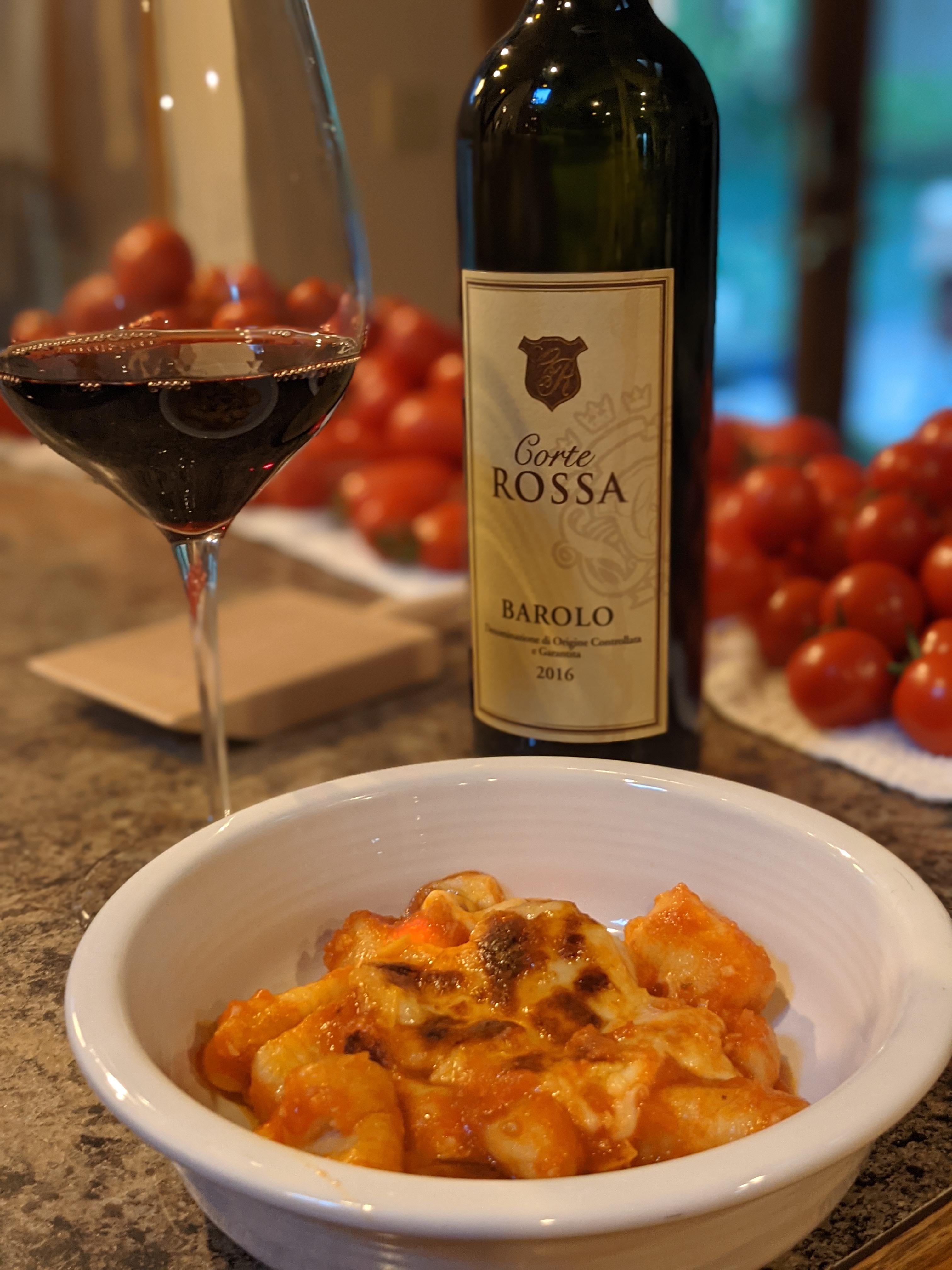 Gnocchi al Forno, gnocchi is one of the more difficult things to prepare even though it is such a simple recipe. Everything here I made from scratch with the exception of the Barolo