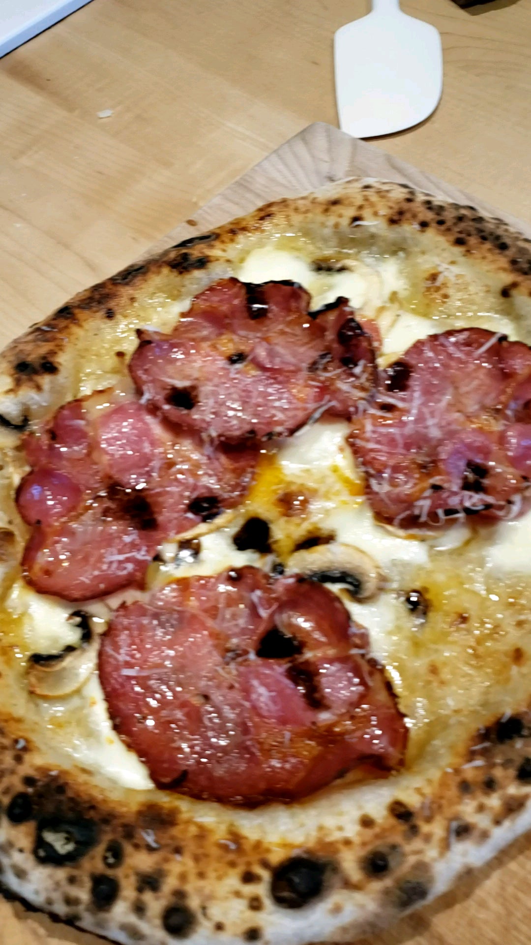 thebreadclass 5 years ago Pizza N.1 = San Manzano with Buffalo Mozz, prosciutto, basil and home made chili oil. N.2 = White sauce, mushrooms, spicy capocollo and homemade back garlic oil. Both finished with parmesan and manchego cheese