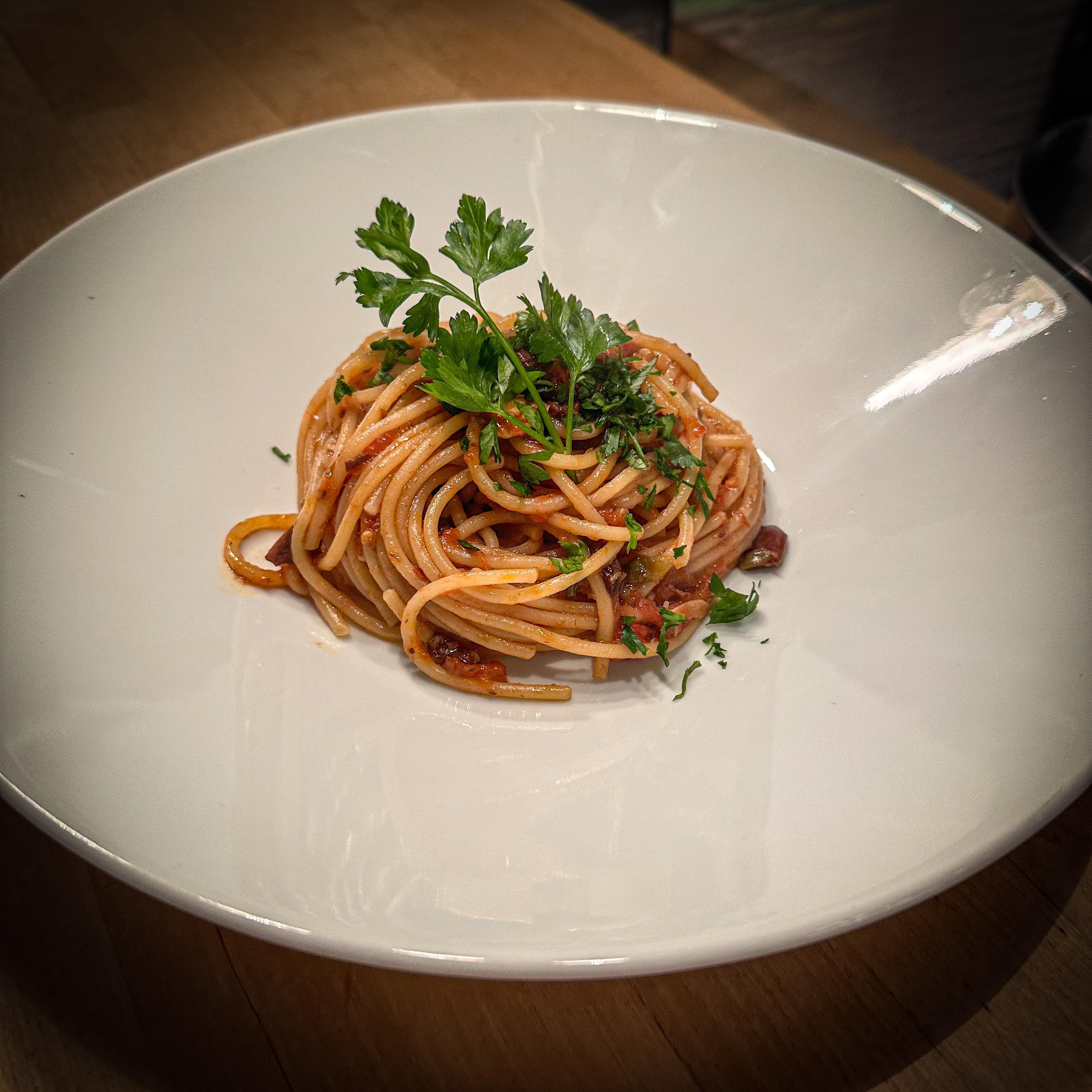 * Add 150 g spaghetti, slightly undercooked, straight from the boiling water with tongs without draining, mix and continue to cook for 3 minutes until thickened.