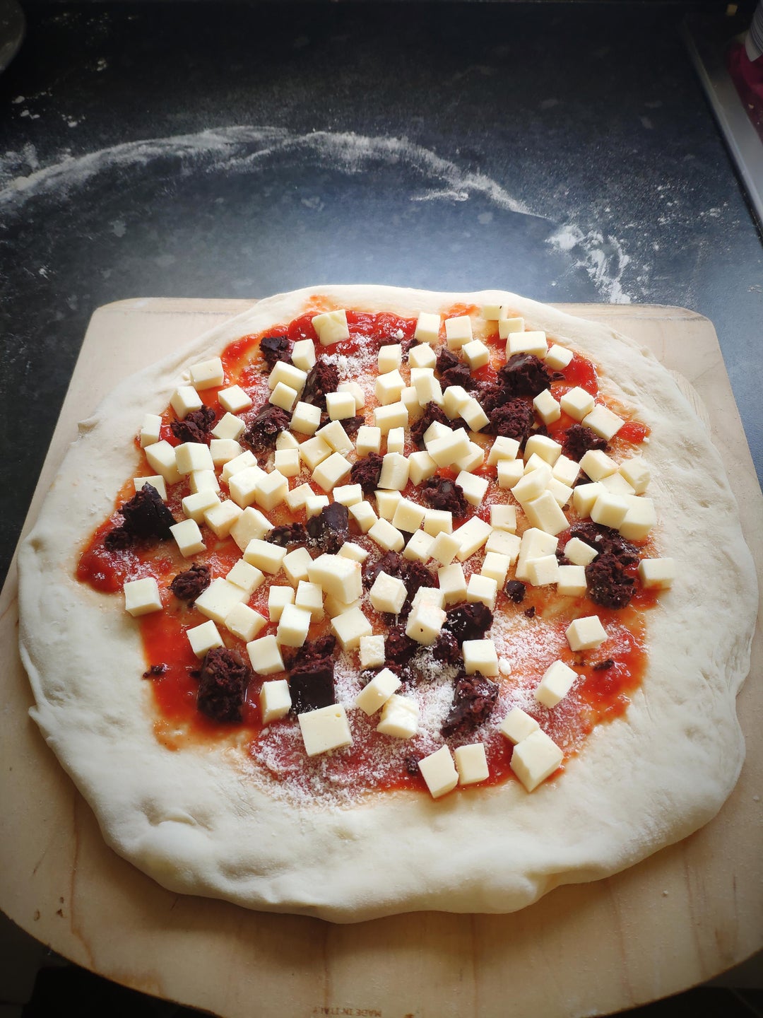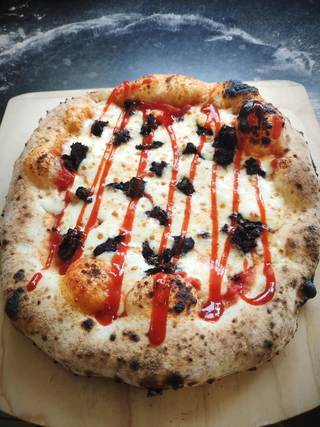 Bit strange combo but tasted superb..The usual tomato, pecorino, mozzarella, and then black pudding and sriracha sauce to finish it off.