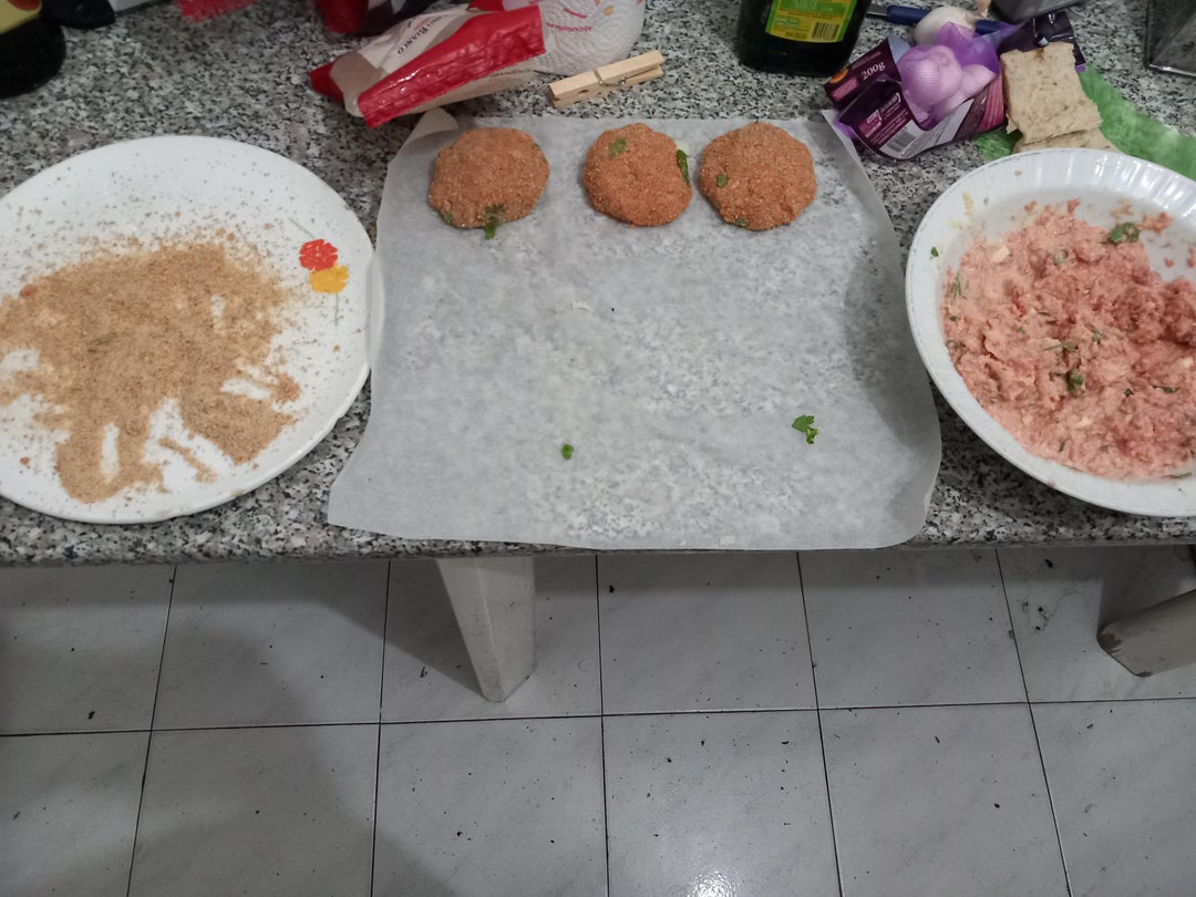 4)prendi una pallina di impasto, arrotondala, e spargici sopra il pangrattato. NON mettere la palla direttamente nel pangrattato: rischi di fanre assorbire troppo, rompendo la polpetta.