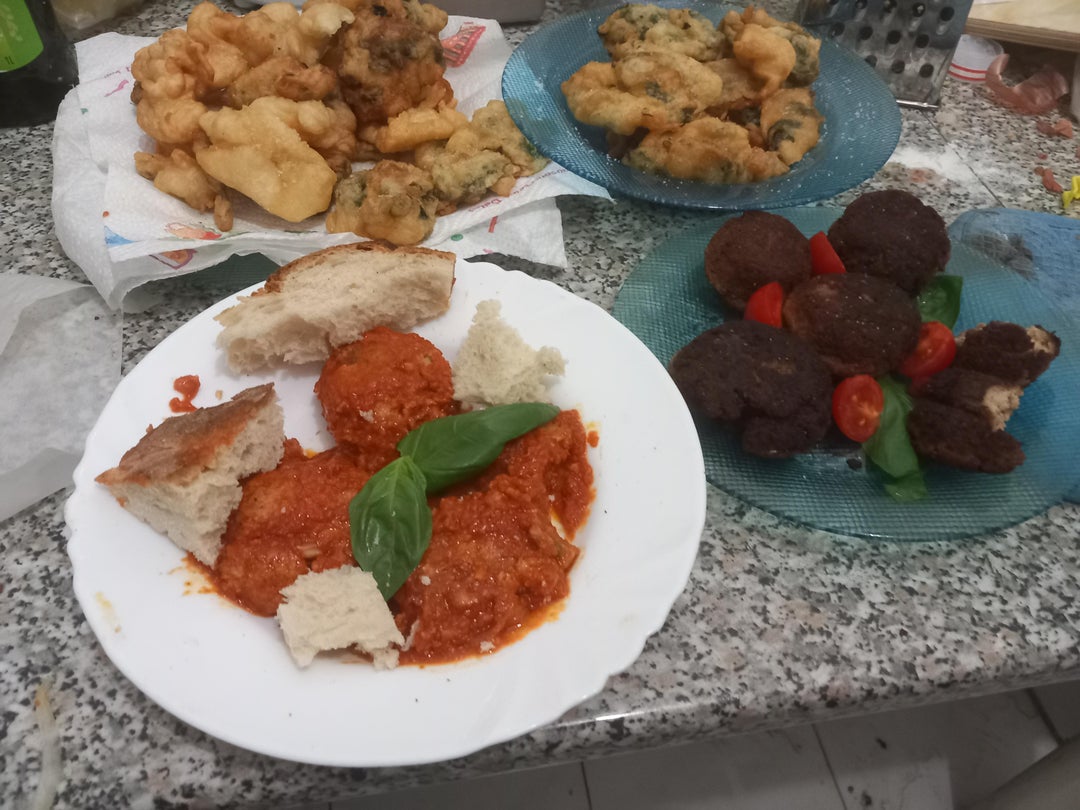 Polpette -pane con molta mollica -latte -uova (1 per persona) -sale -aglio -formaggio grattugiato (nel mio caso pecorino romano) -basilico, o altre erbe a piacere -pangrattato -carne tritata Le proporzioni sono molto a piacere: la consistenza deve essere molto morbida. L’ideale sarebbe farle croccanti fuori e morbidissime dentro. 1)leva la mollica dal pane, mettila in una ciotola ed aggiungi il latte. Inzuppala e aspetta, non in frigo. 2)versa via il latte in eccesso: deve essere QUASI tutto assorbito 3)versa uovo, aglio, sale, formaggio, carne ed erbe insieme e mischia 4)prendi una pallina di impasto, arrotondala, e spargici sopra il pangrattato. NON mettere la palla direttamente nel pangrattato: rischi di fanre assorbire troppo, rompendo la polpetta. 5)Versare in una padella o in una ciotola con sugo. Salare quelle bianche. Aspetta che quelle al sugo si raffreddino: serve per fargli guadagnare consistenza. Frittelle -acqua 500 ml -lievito di birra 6 gr -farina meno di 500 gr -sale -zucchero -TANTO olio di mais 1)mischia mezzo chilo di farina e mezzo litro d’acqua, versaci 6 gr di lievito e mischia. 2)aspetta 1 ora. COn queste proporzioni l’impasto non cresce molto, ma vi devono essere delle bolle particolarmente visibili. 3)Riscalda l’olio TANTO e, nel frattempo, butta nell’impasto il condimento, se lo vuoi. 4)butta l’impasto nell’olio con un cucchiaio. E’ fondamentale usare uno strumento non troppo capiente, poiché con queste proporzioni l’impasto è pieno d’aria e si gonfierà molto. Metterne troppo lo farà restare crudo dentro. 5) asciuga e sala/zucchera