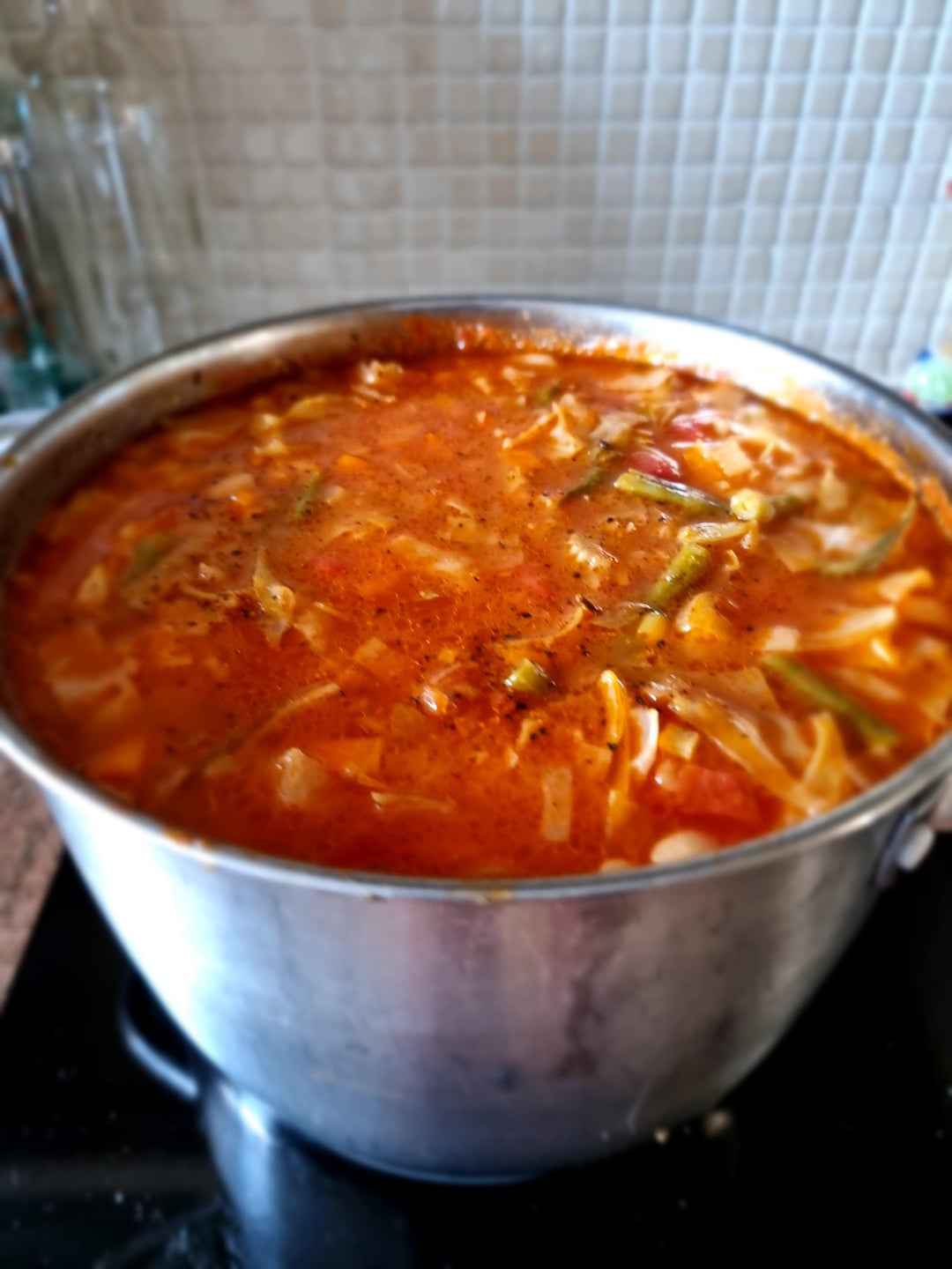 Then add chicken stock to the pot. If you don’t have a home made stock you could use 3 chicken stock pots and add water. Make sure you have enough stock and it always covers the vegetables. Add more if needed.