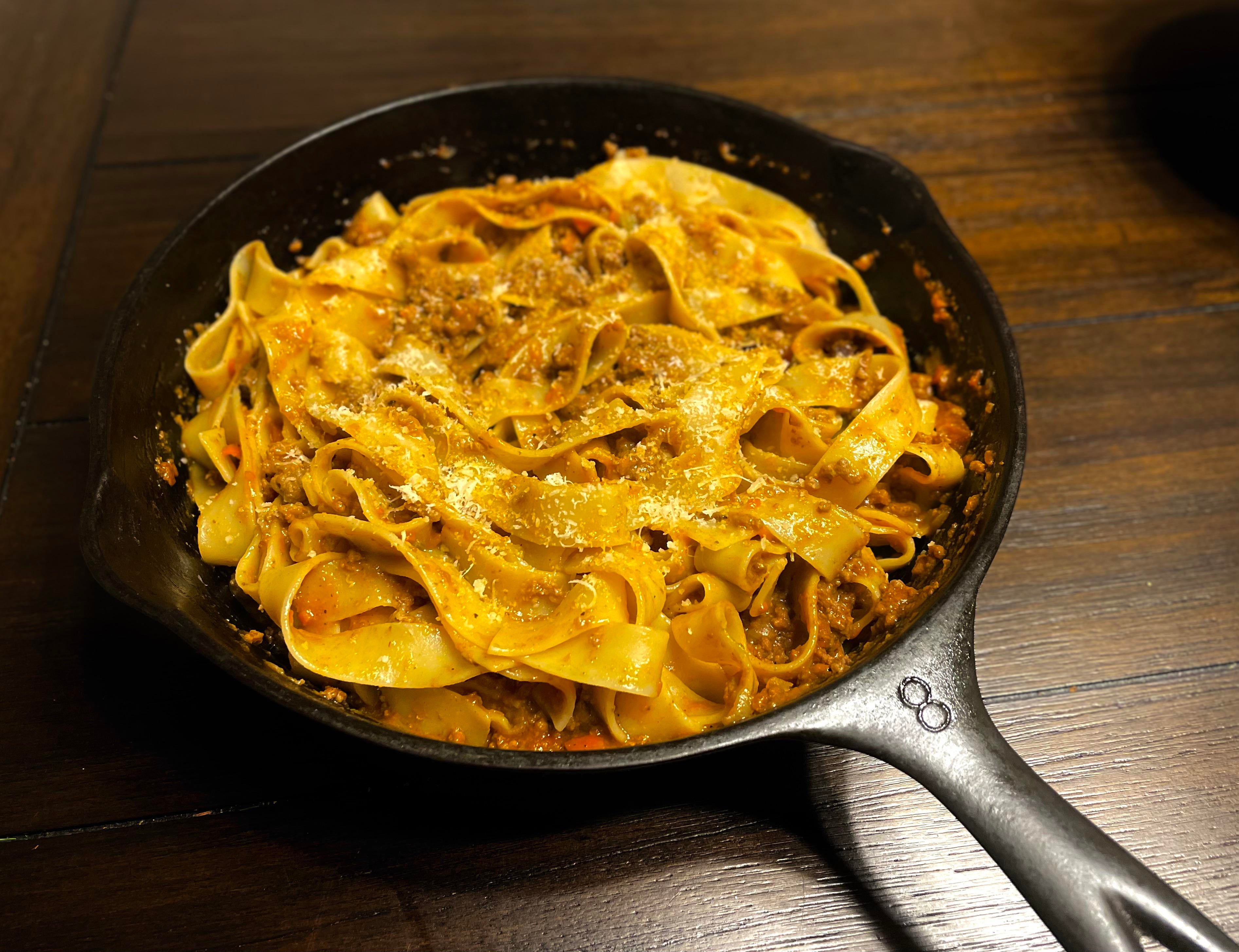 Seared 1lb ground beef, rendered some pork jowl, sautéed mirepoix instead of sofrito, deglazed with Chardonnay, stirred in 1/3c tomato paste, bare simmered down with 1c 2% milk and 2c chicken broth for about 3-3.5 hours. Tossed in some Al dente pappardelle and a splash of pasta water and topped with parmesan.