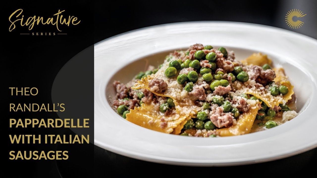 Theo Randall combines pappardelle pasta with hearty Tuscan sausages, peas and butter in this comforting pasta dish, which is ready in under 30 minutes.