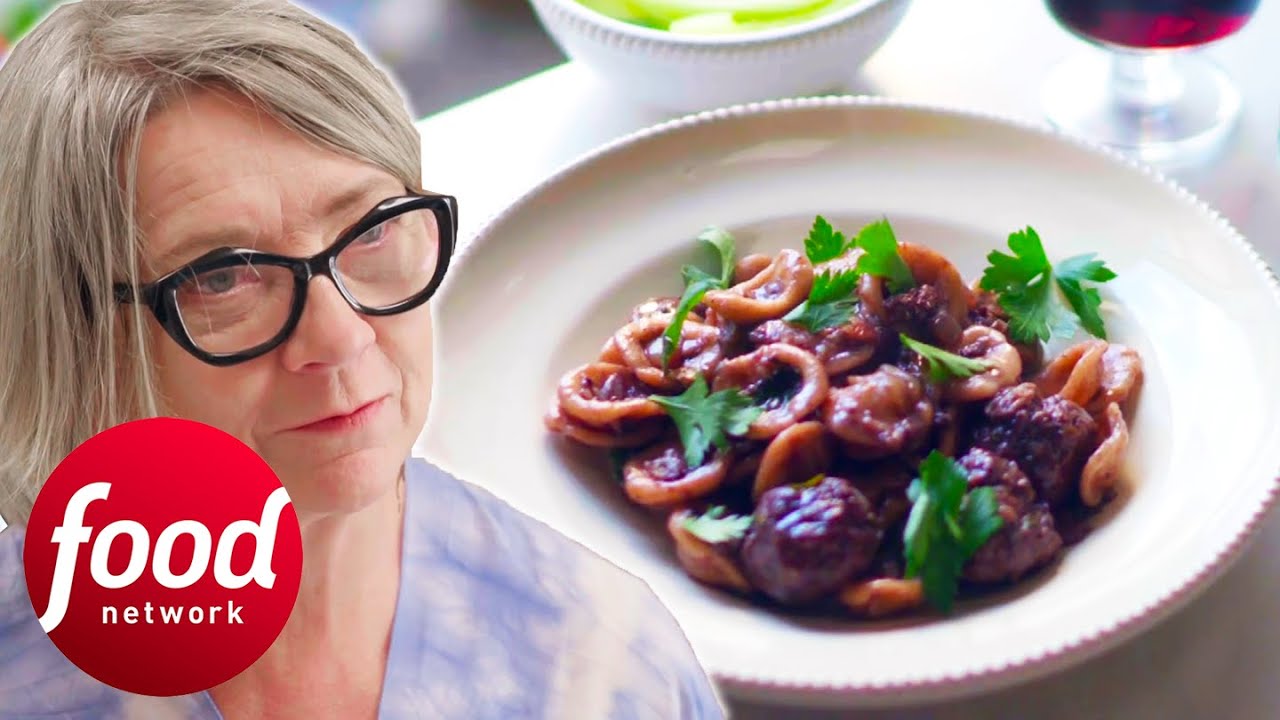After purchasing produce from the local butchers, Sophie Grigson uses fresh local ingredients for Orecchiette al Primitivo di Manduria – meatballs cooked with good-quality red wine.