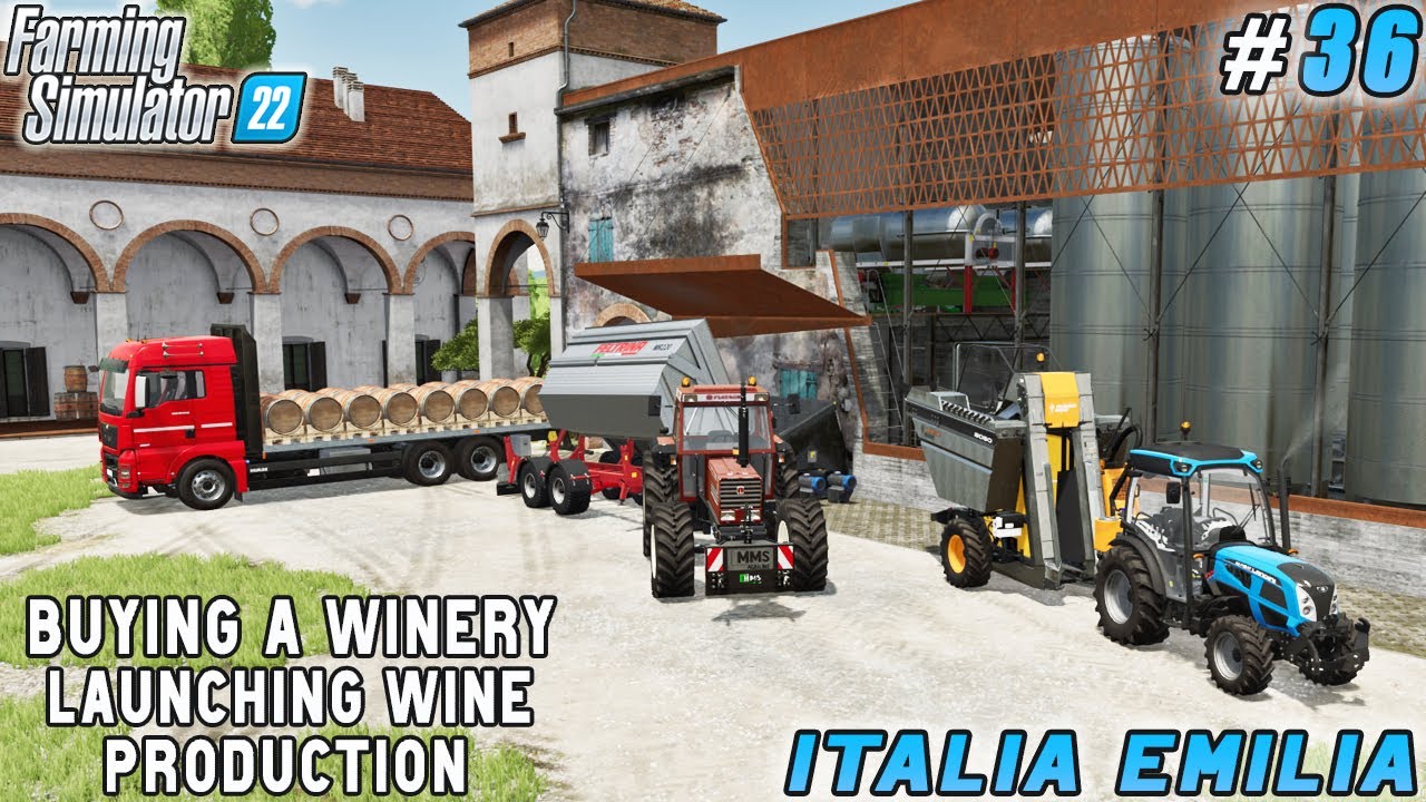 Welcome back to the Italian Farm Timelapse. It’s a beautiful morning in sunny Italy and we need to harvest grapes. First, let’s deliver the finished products from our vegetable oil production to the point of sale. Now we are buying a new Landini REX 4 GT tractor to work in the vineyard and also rent a Pellenc 8050 trailed harvester for grape harvesting. We also rent trailers for transporting grapes. We bought a wine production plant earlier and we need barrels to start wine production. We do not yet have our own production, so we buy barrels and deliver them to the yard.
