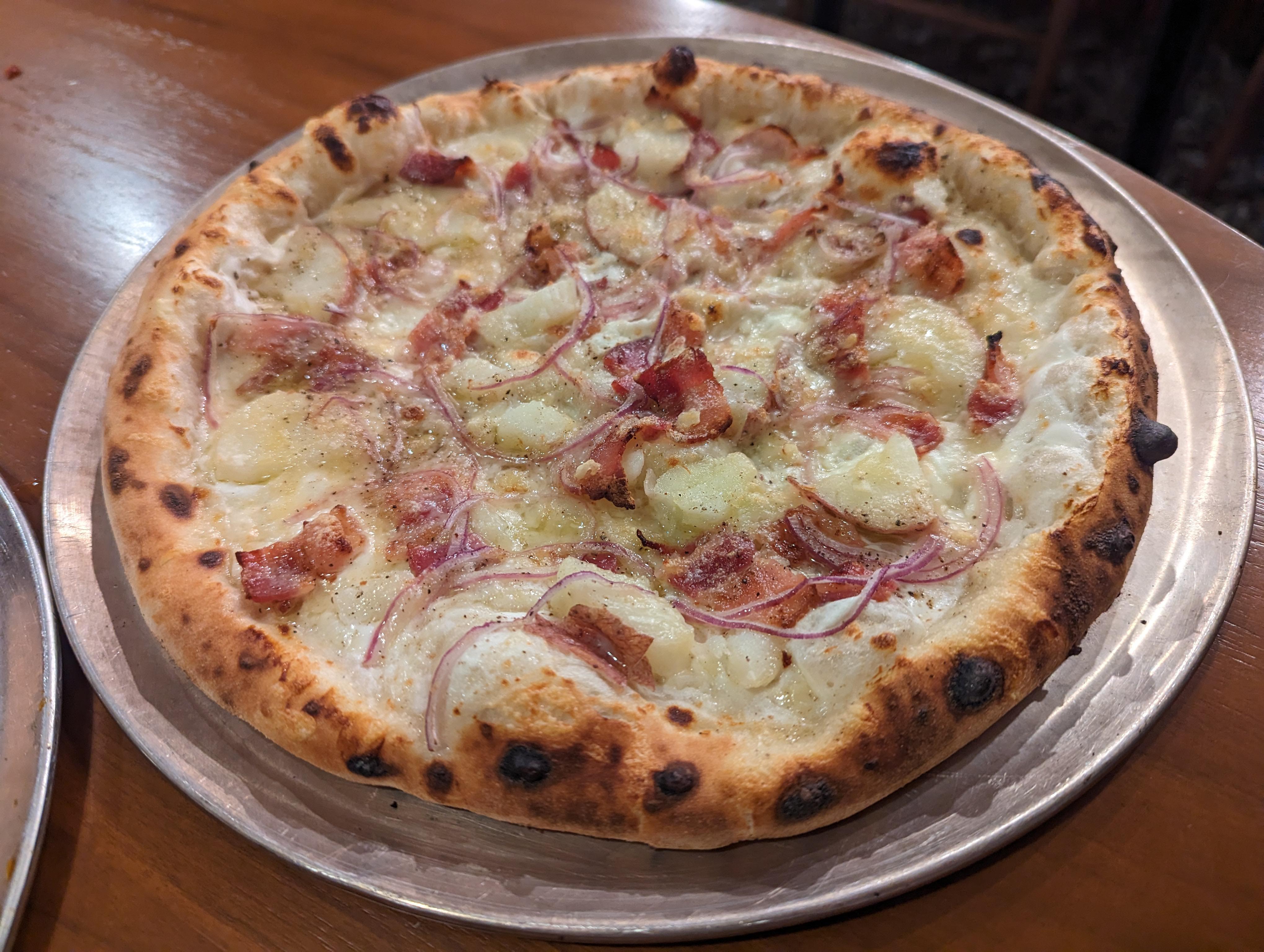 This one is a 280g Neapolitan dough ball (pizzaApp recipe, 65% hydration, 3% salt), 2% Greek yogurt base, sliced red potatoes (just what I had in the house, leftover potatoes are better but I didn’t have any so I just microwaved some), red onions (very thinly sliced with mandolin), bacon (pre-cook halfway in frying pan first, then chop), gruyere shredded on top and some freshly ground black pepper.