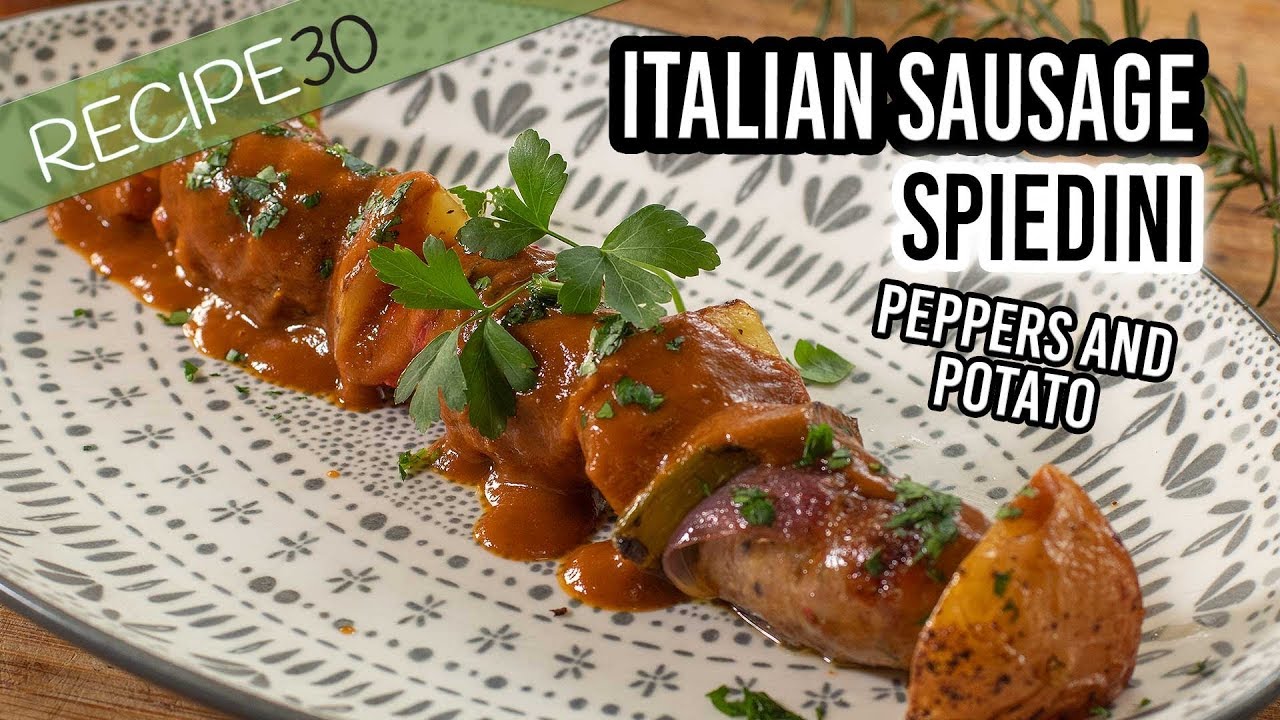 A simple yet very easy to make Italian dish using country style Italian sausage, peppers and potatoes. The skewers are slow cooked in the oven for one hour resulting in the sausage fat mixing with the roasted vegetables for an incredible gravy.
