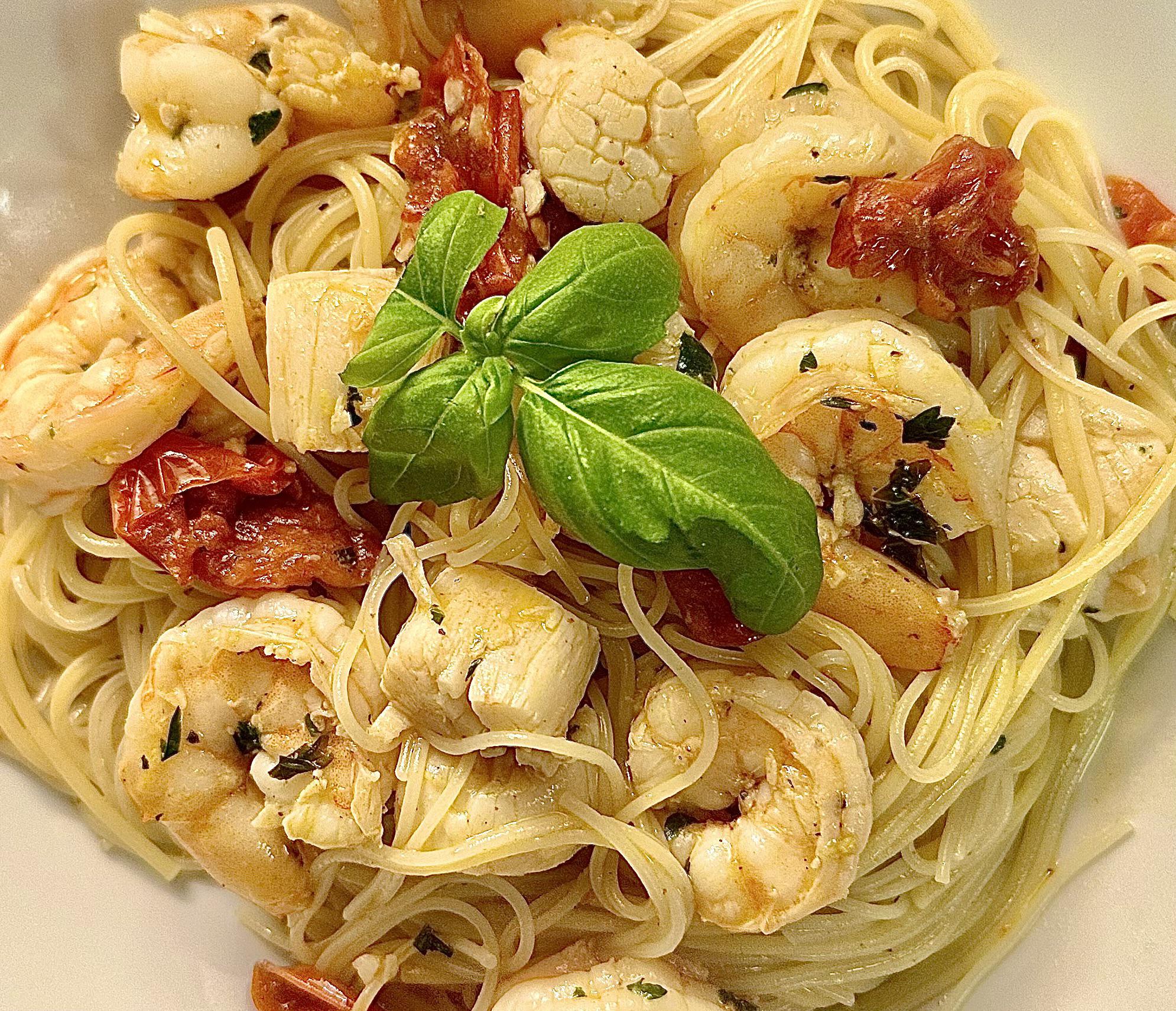 Shrimp and scallops aglio e olio con pomodorini over angel hair. That’s a mouthful. 😉 Recipe in comments.