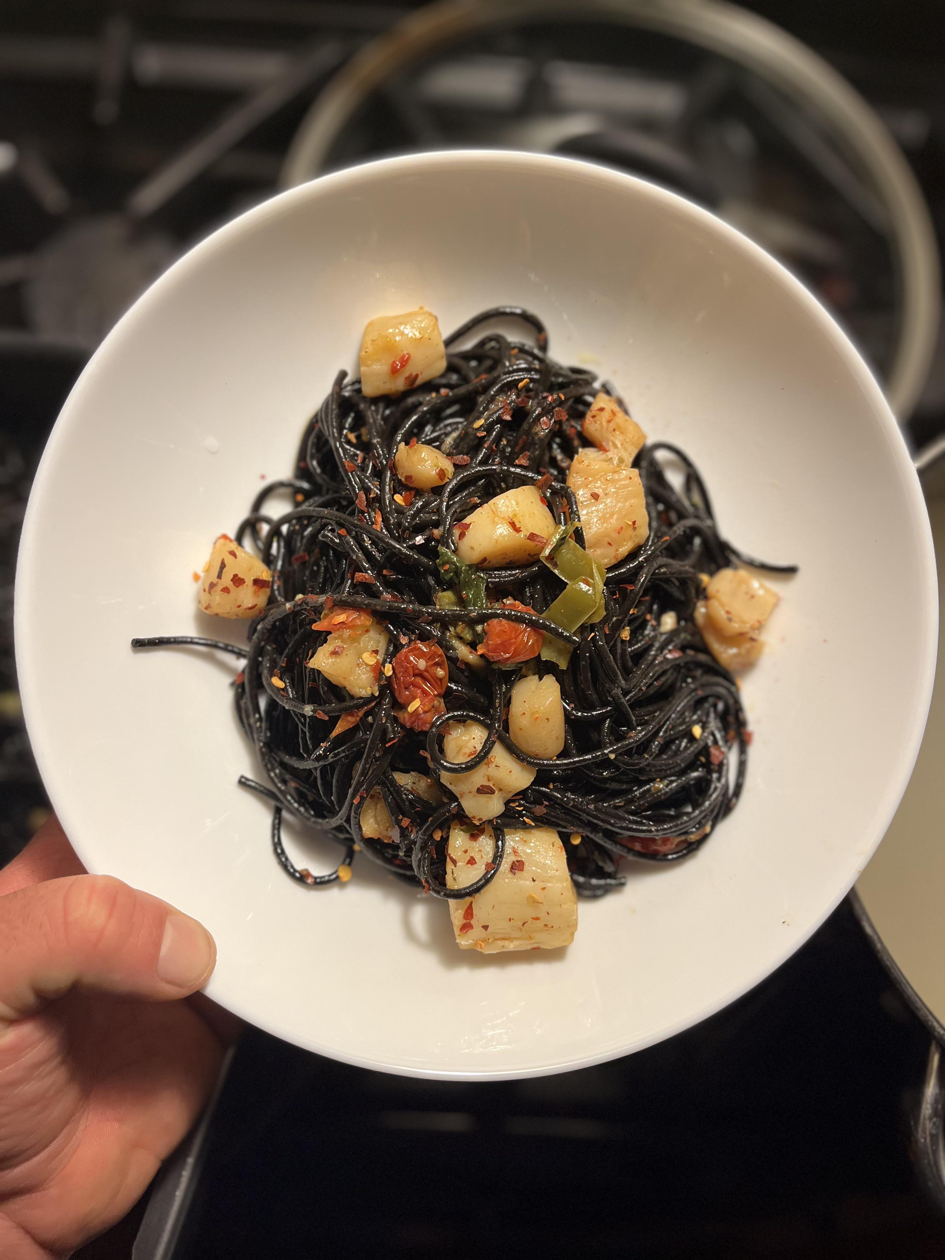 Squid ink pasta with light tomato sauce, pepperoncino and scallops