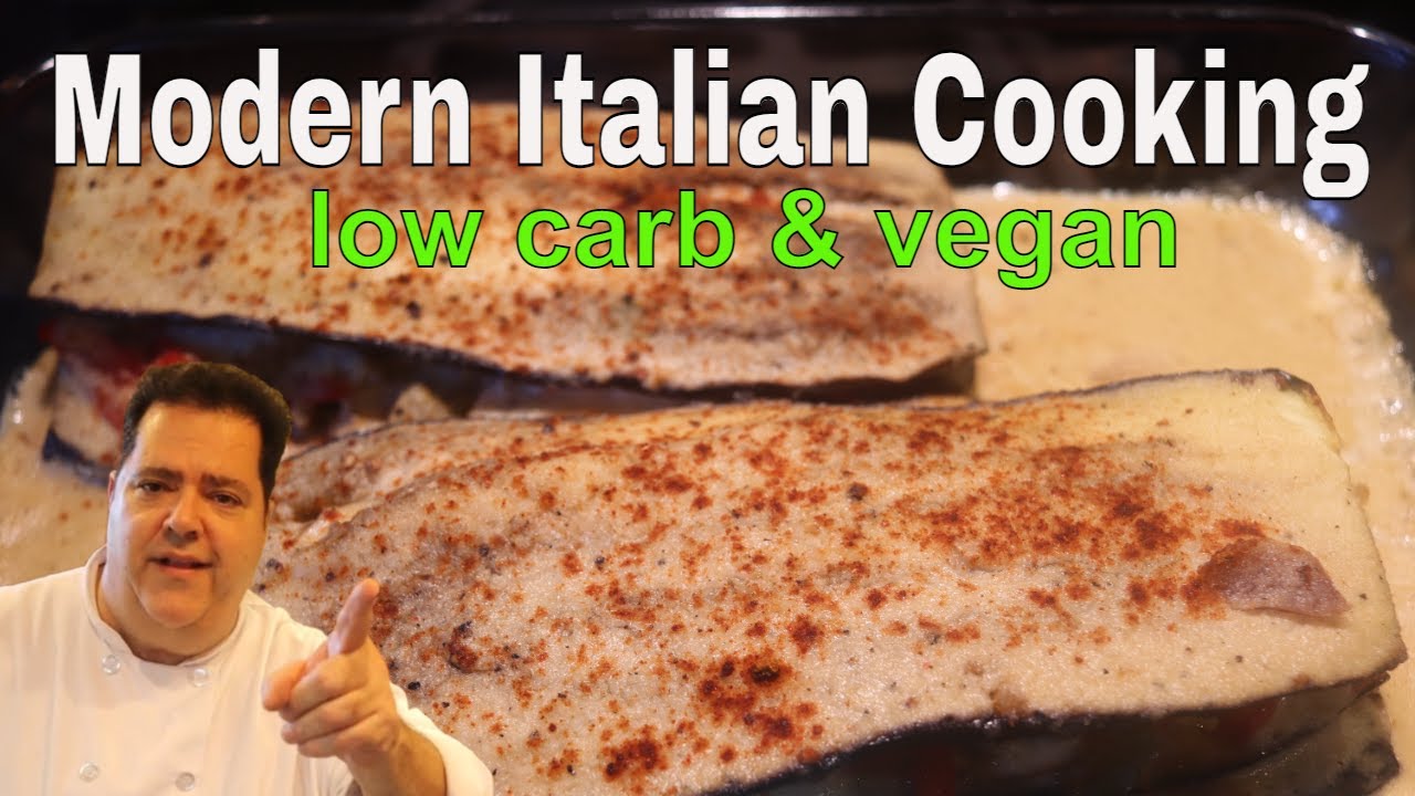 Modern Italian Cooking is about lightening up Classic Italian Cooking. In this case . . .”Eggplant Parmesan” No breading, baked, not fried and a vegan sausage stuffing. Not to mention a vegan bechamel cheese sauce.