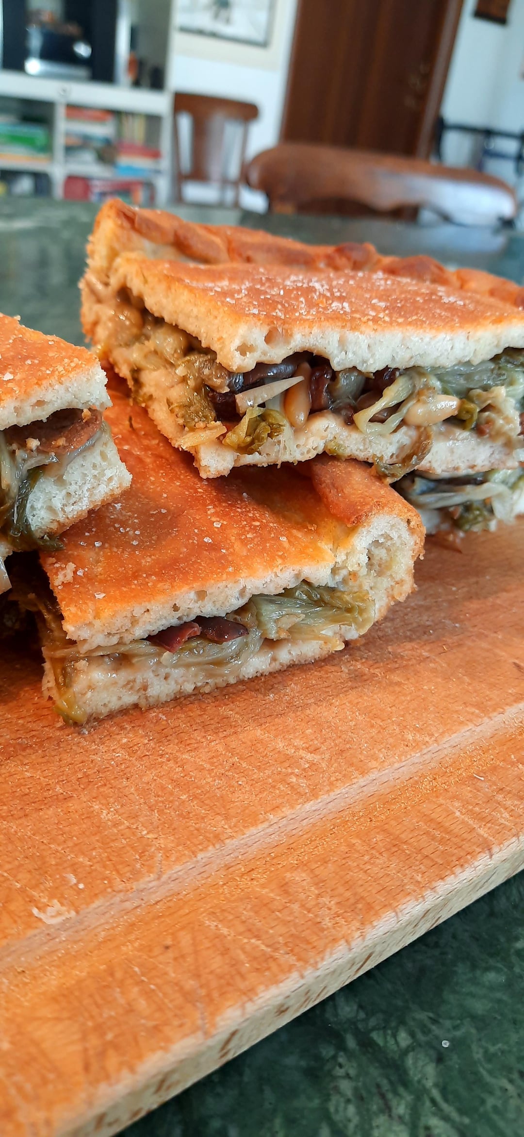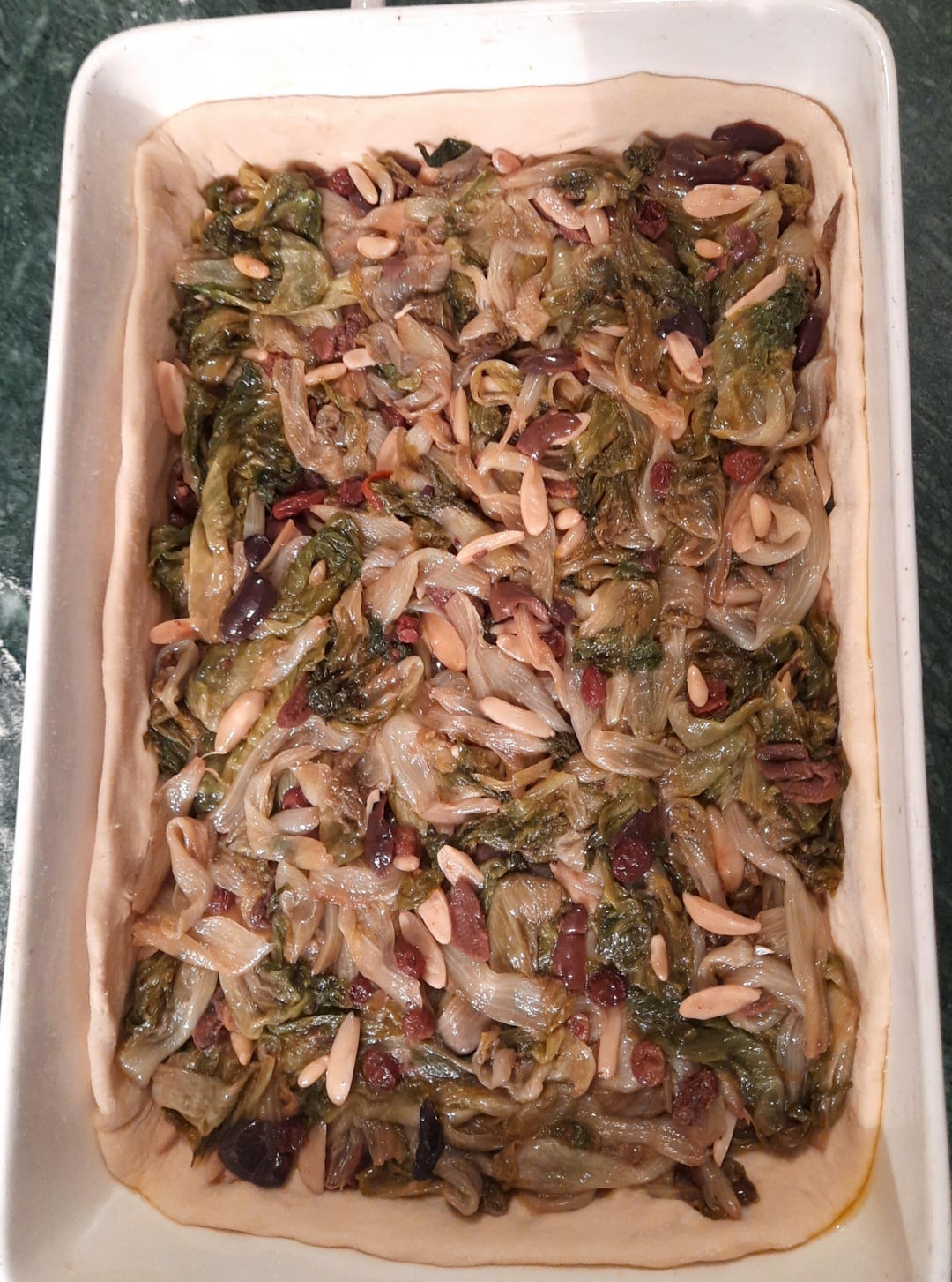 Escaroles are sauteed with evo oil, garlic, chily flakes, salted anchovies, black olives, raisins, pine nuts and almonds, while the dough was 500 g flour, 270 g water with a teaspoon of sugar and a dose of dry yeast, 3 spoons of evoi oil, 15 g salt to add a the end. It raised till it doubled the size, then the pizza was styled and cooked at 190° ventilated for 30 minutes. The result is so tasty, only problem is that I might have to freeze it or i’ll eat it all in one day