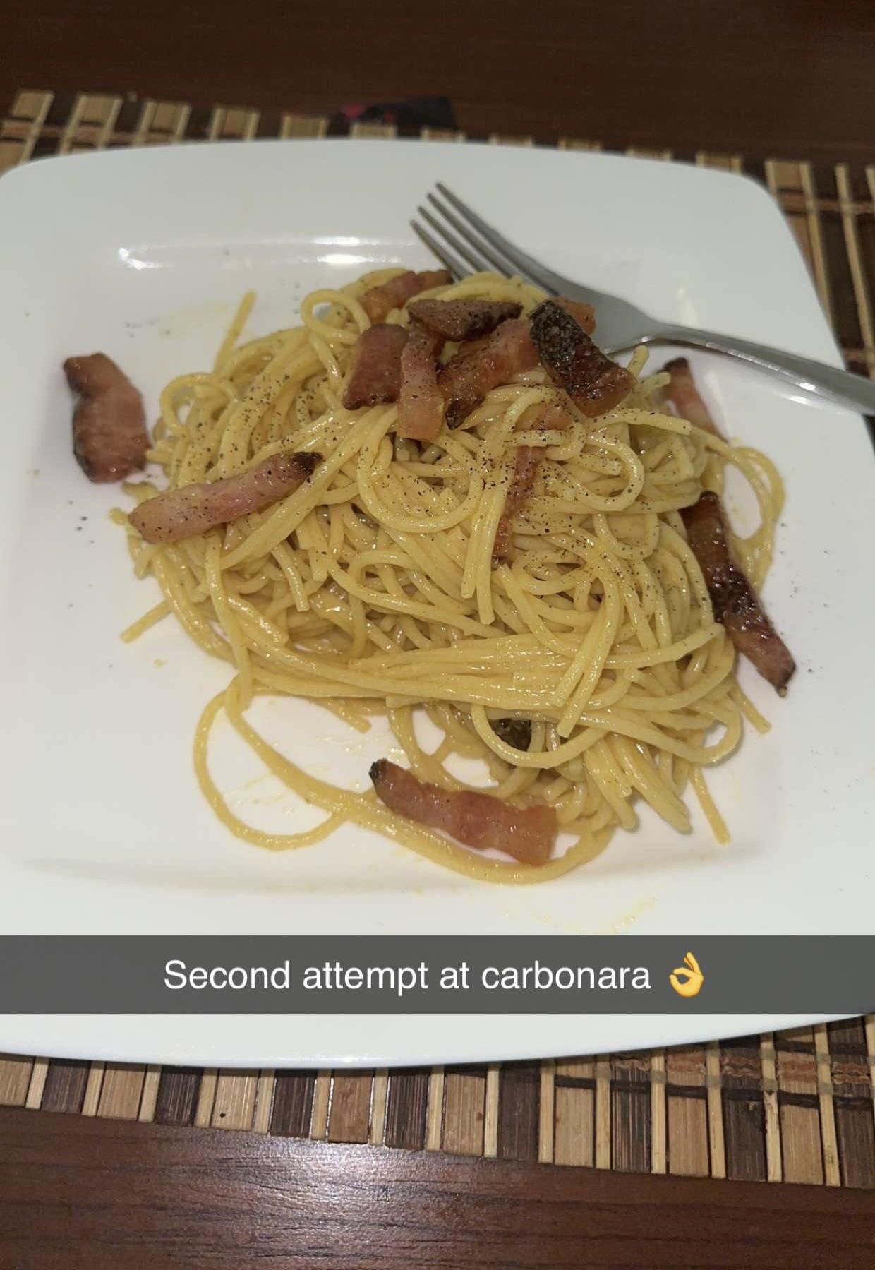 My second attempt at spaghetti alla carbonara. Used regular pork jowl bacon instead of guanciale since it’s hard to find in Texas, and my apologies that the black pepper was not freshly ground. The sauce was THICC and creamy 😩 Such a simple yet delicious dish.