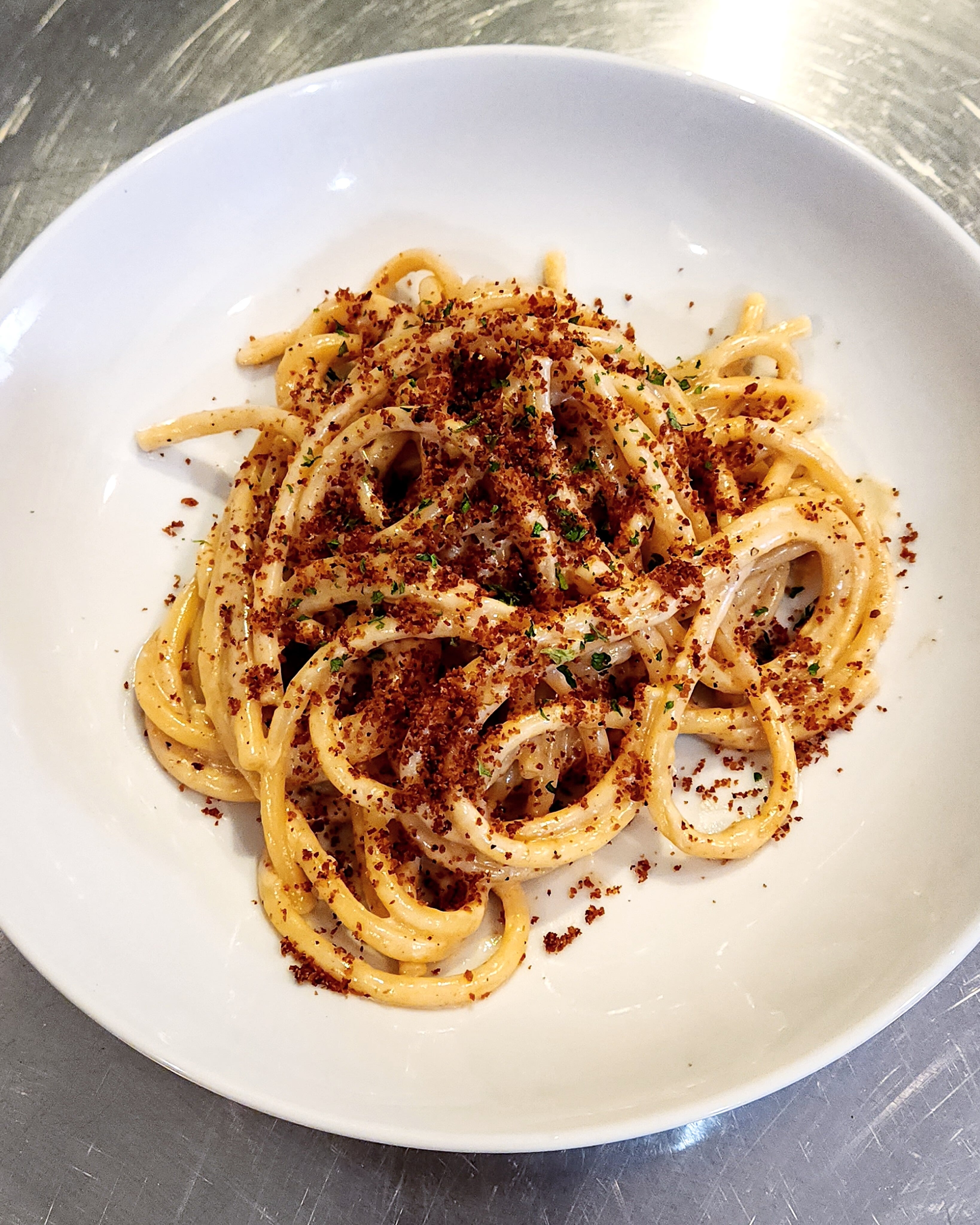I made bagna cauda since I had a ton of garlic sitting around, then decided on a whim to build it up into a light cream sauce with nutmeg and pepper to dress bucatini and topped it with a calabrian chili & brown butter pangrattato. Not an “established traditional” Italian recipe, but certainly something that feels at home within Northern cuisine, and really delicious.
