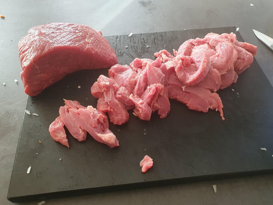 For the meat, I don’t use ground meat. I buy the meat in one piece and cut it into 2 x 2 cm cubes. These I flour lightly and finally fry the cubes in a large roaster sheep in olive oil and a little butter. Once the meat is roasted on the outside, remove it from the roaster and set aside briefly.