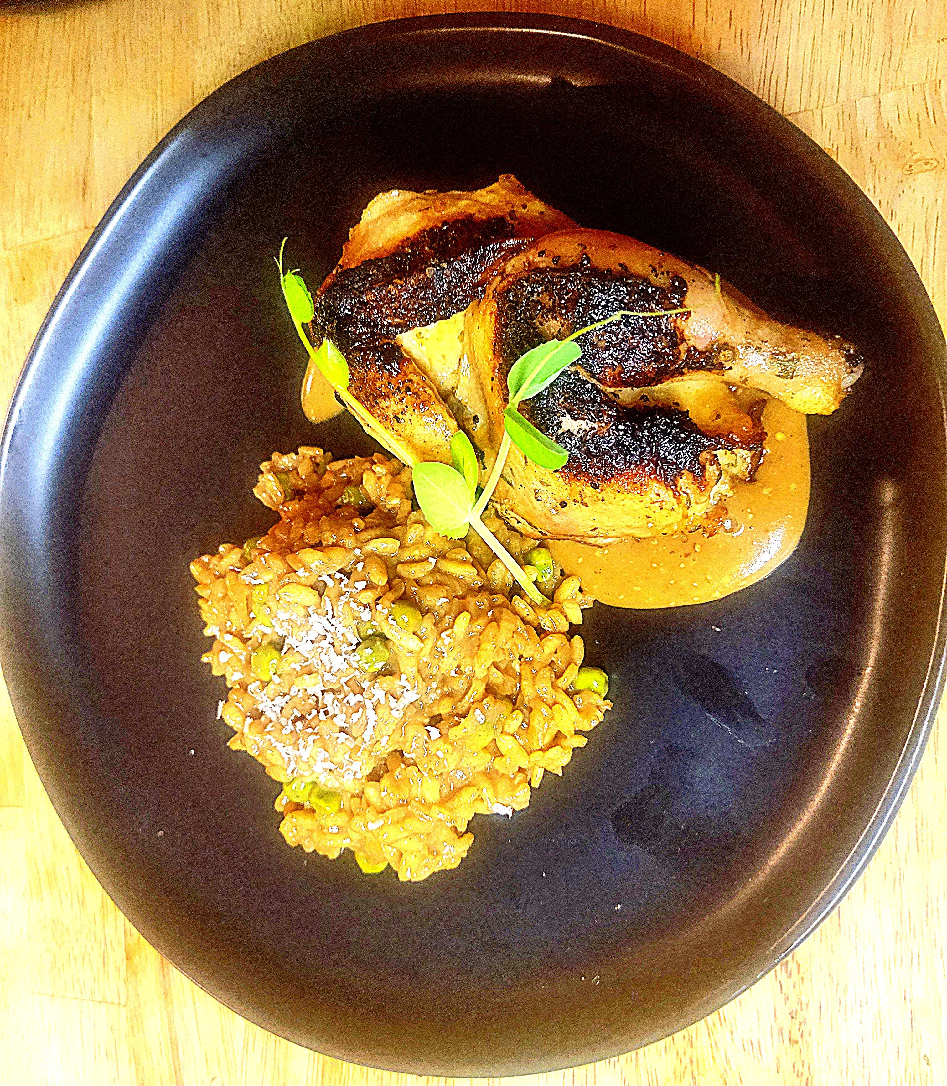 Fresh Pea Risotto with Herb Butter Seared Game Hen and Pan Sauce