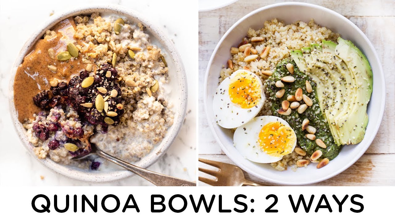 Here are two healthy quinoa breakfast bowls: one sweet, one savory! We’re making a coconut quinoa breakfast bowl as well as a savory quinoa breakfast bowl with pesto and poached eggs. These are high protein breakfast recipes that can be made ahead and meal prepped!