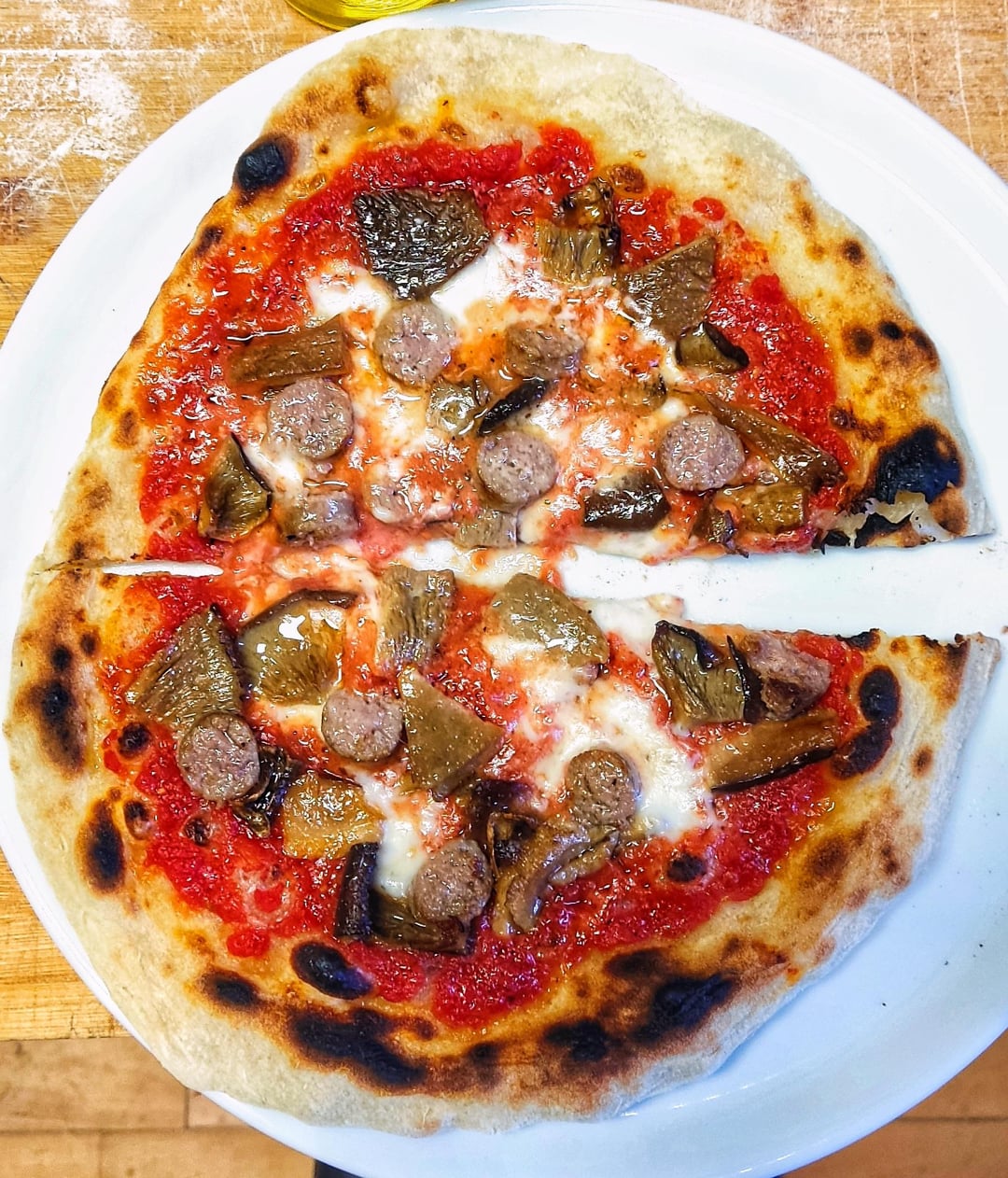 Mushrooms, salsiccia, mozzarella and tomato.